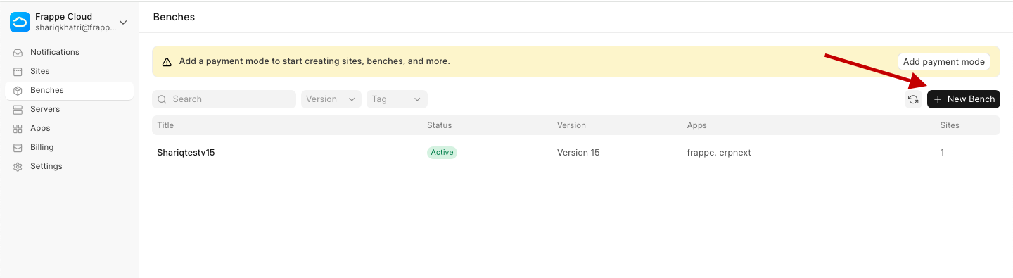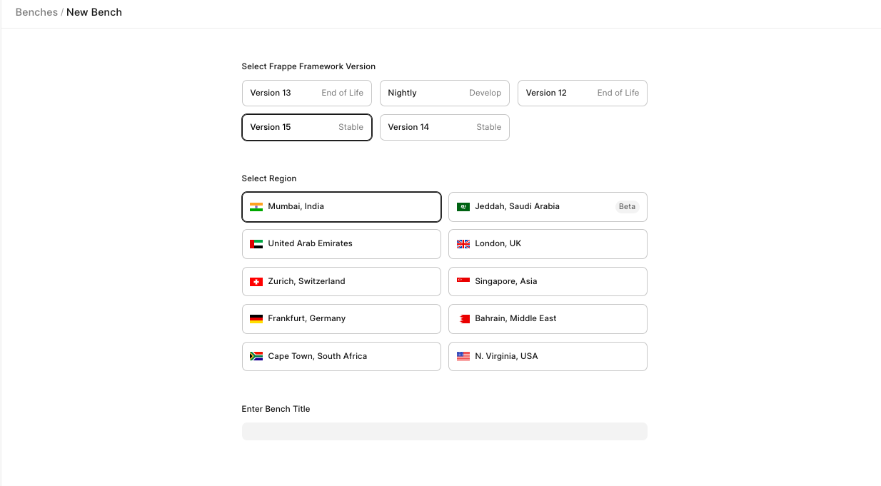 Click on the + New button from your Frappe Cloud dashboard and select Bench Group: