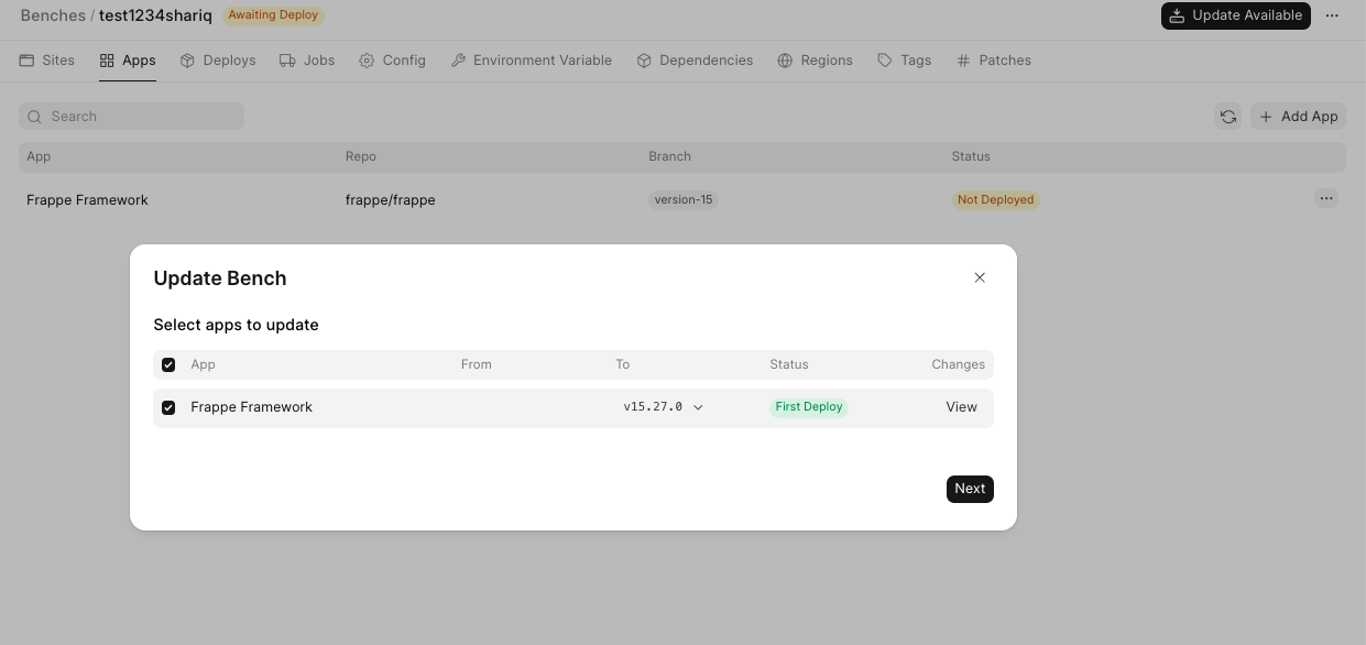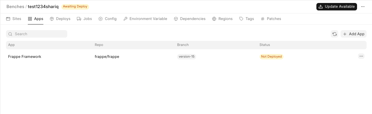 Then click on the Create Bench Group button. Once the bench group is created, you will be navigated to the bench group dashboard page. A bench is not automatically deployed, you have to click on the Updates Avaliable button.