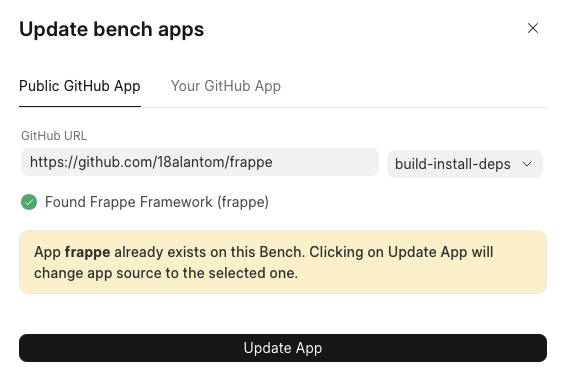 To update the source of an app on a bench group, you go through the same flow as above. The only difference is that you will see a banner in the Update bench group apps dialog: