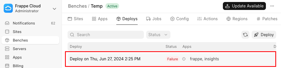 2. Then click on the last Deploy (which should have the status Failure with a "!" next to it):