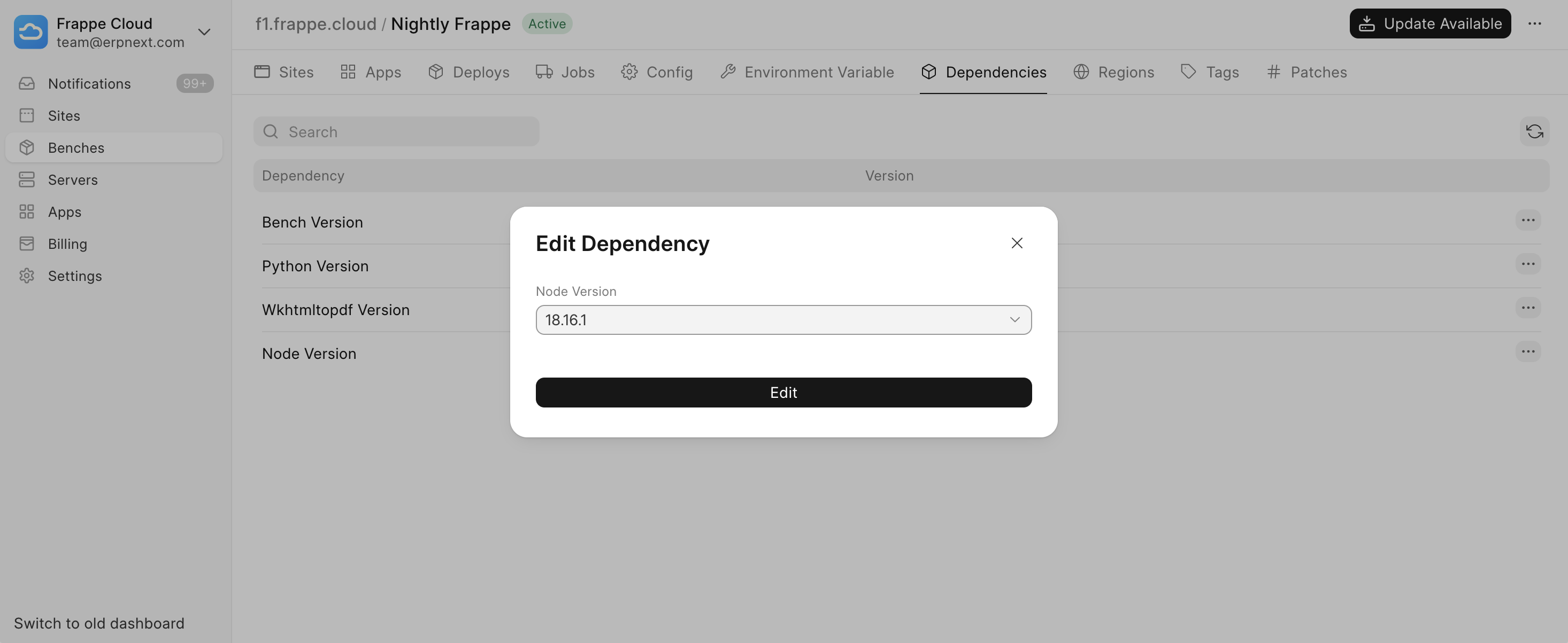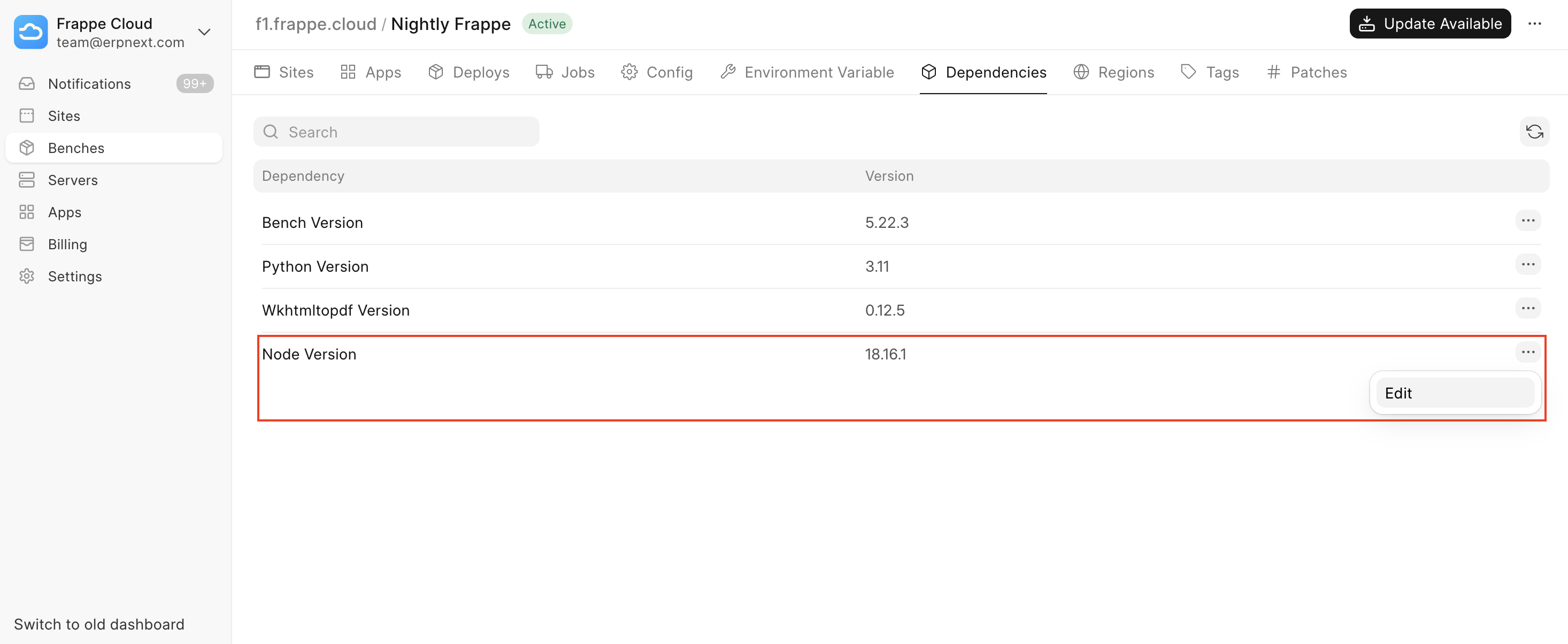 Select the correct Node Version, click on Edit to save the setting. Then try updating your Bench Group.