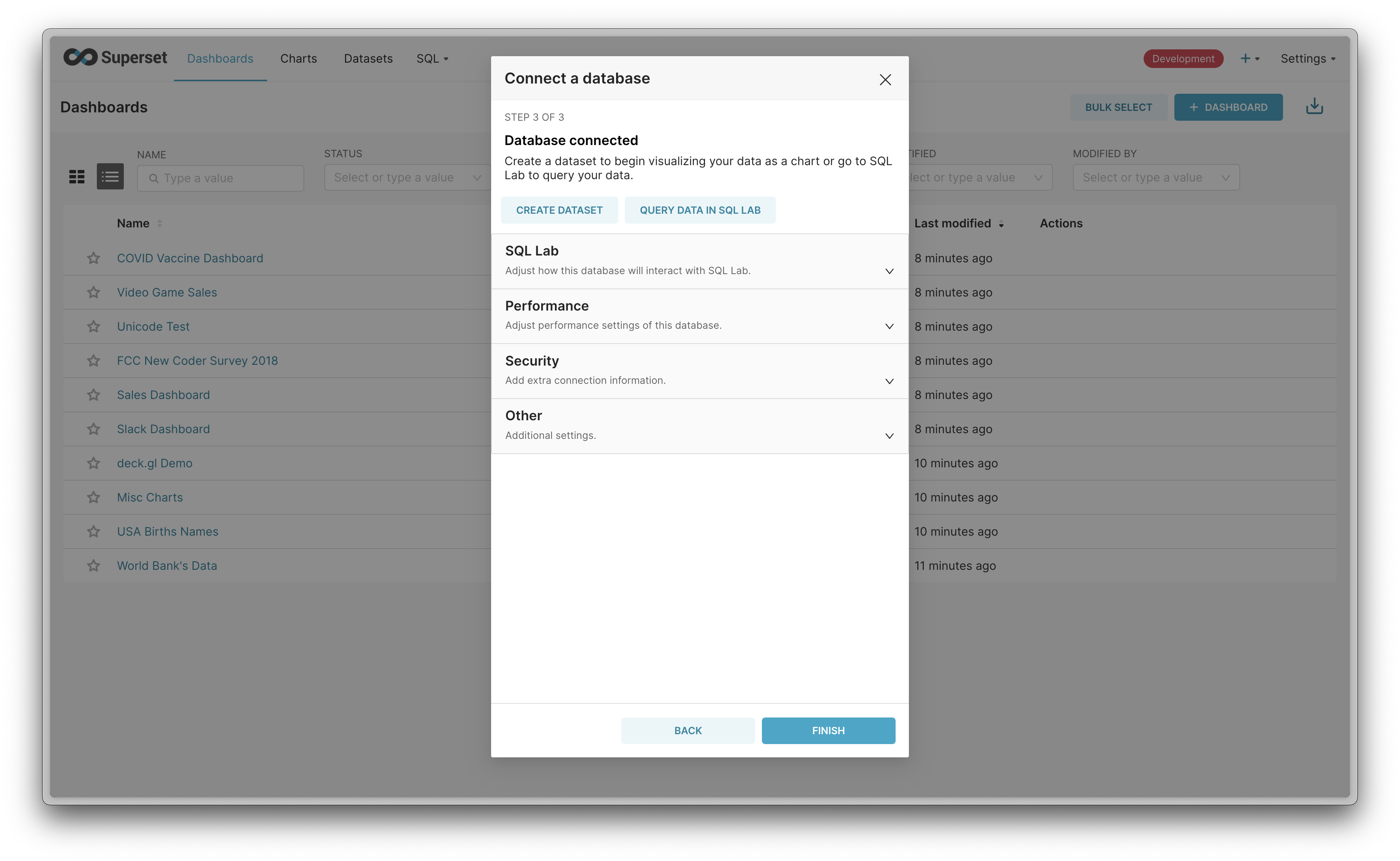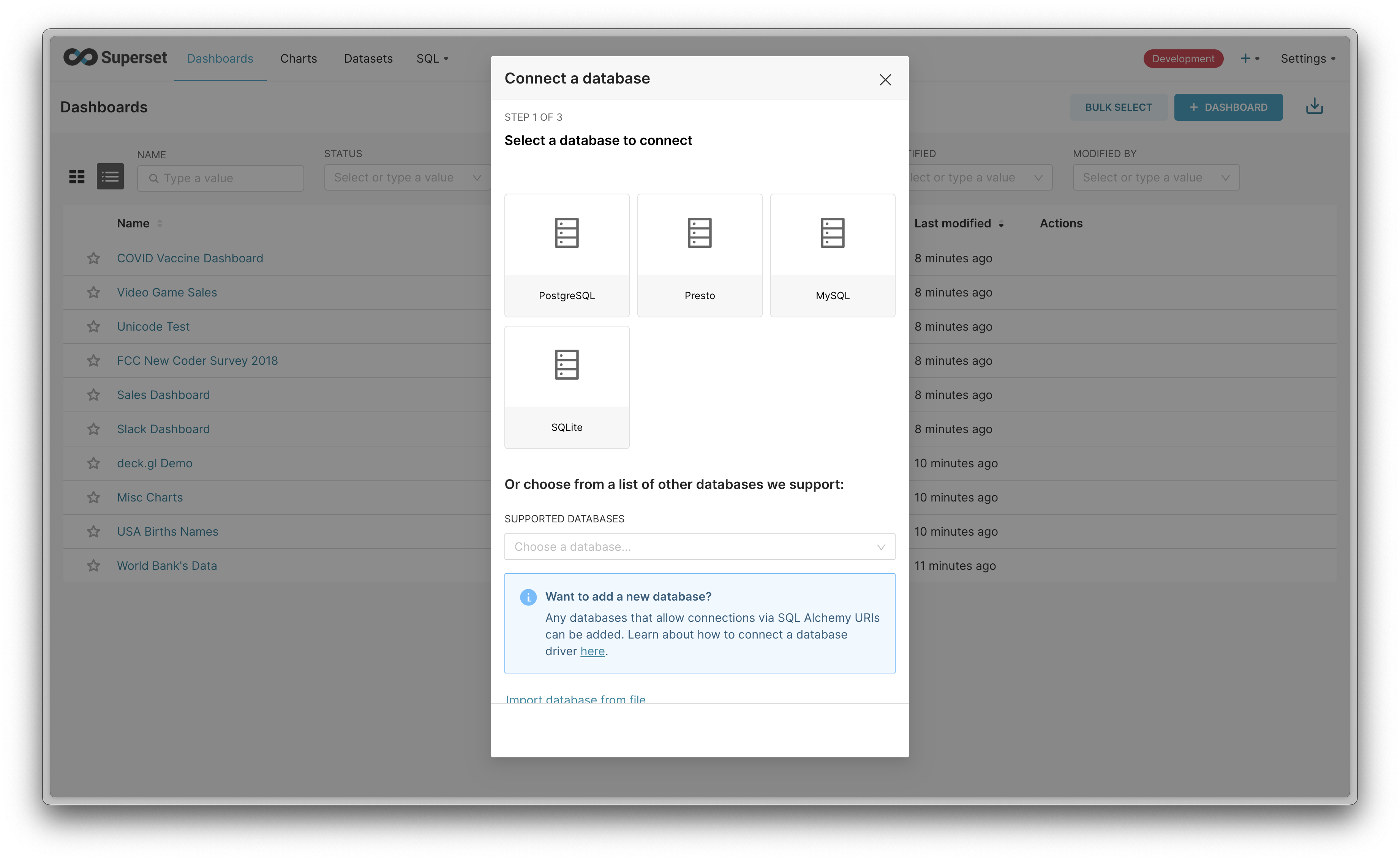 2. Open your Superset dashboard and go ahead with connecting a new database.