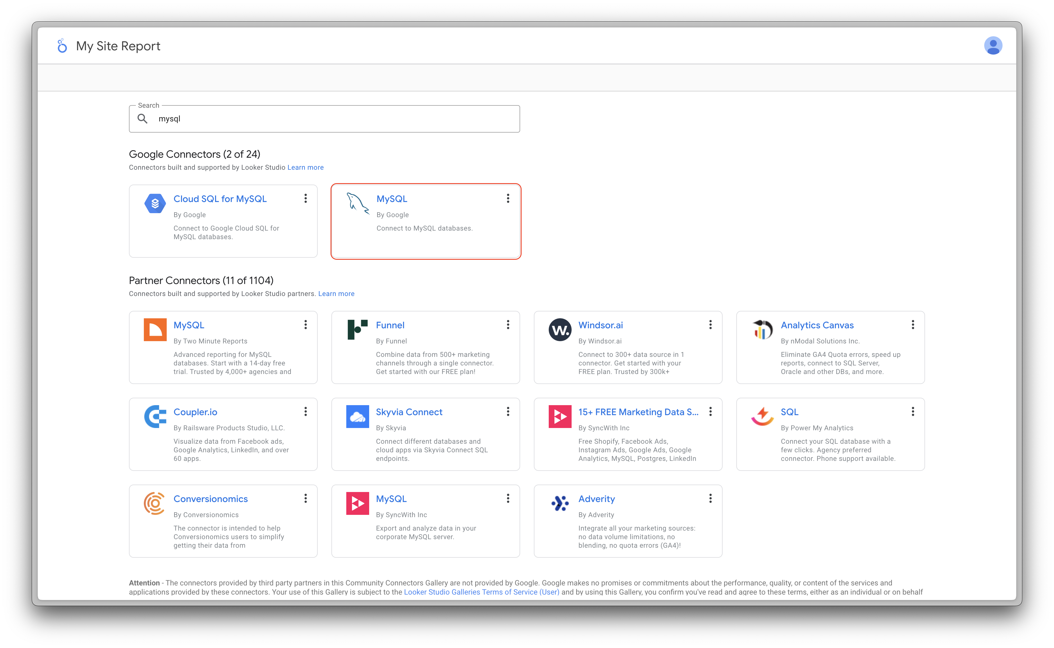 3. Search for mysql in connector list and choose the connector from Google.