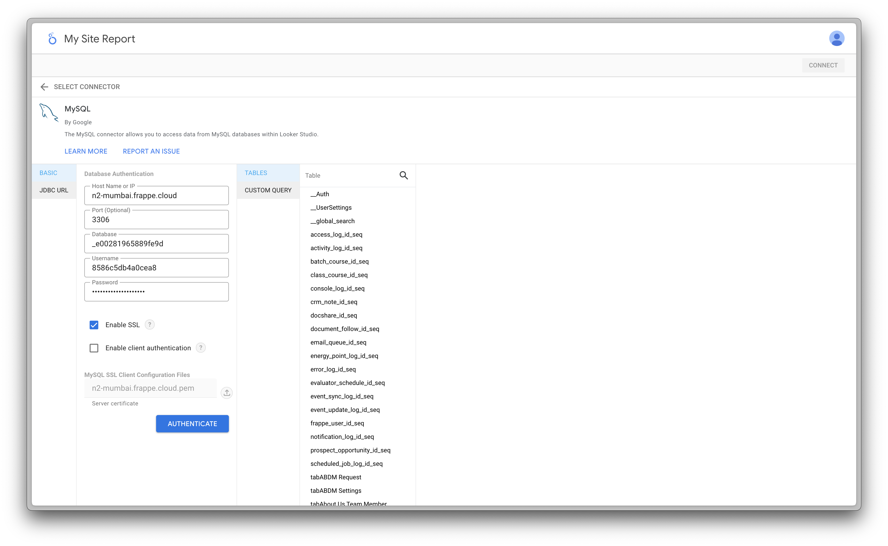 4. Fill up the database user's info and click on Authenticate.