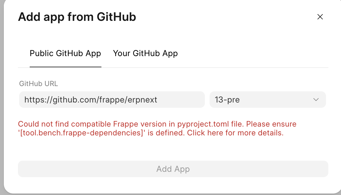 The app branch declares compatibility with a Frappe version different from the bench version.