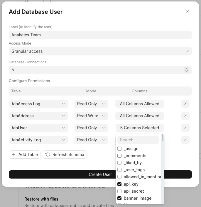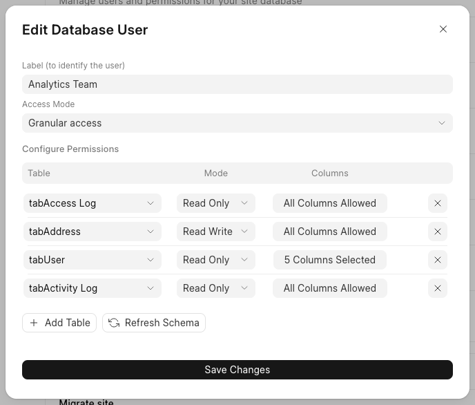 - Granular: This permission mode allows for fine-grained control over a user's access. You can grant access to specific tables and, if needed, even restrict access to specific columns within those tables.
