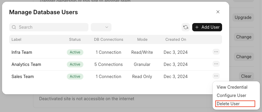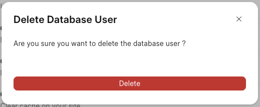 When you click to delete a user, a confirmation modal will appear. Once you confirm the deletion, the selected database user will be deleted.