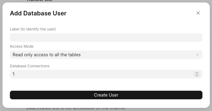 After selecting View Credential, a modal will appear displaying all the necessary information to connect to your site database.