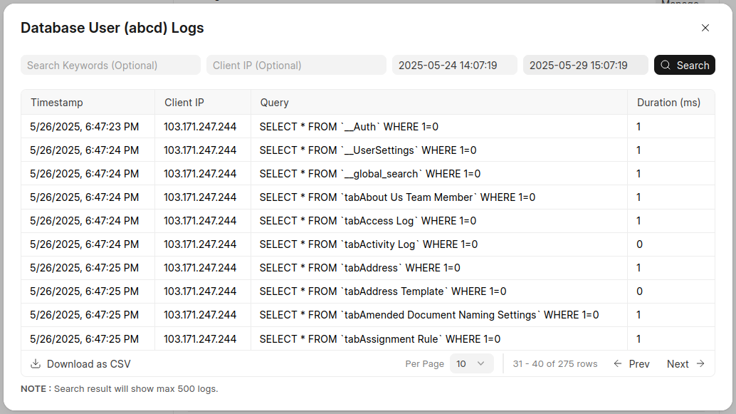 If you want to view all the SQL query pass through FC SQL Proxy service, you can click on View Logs button.