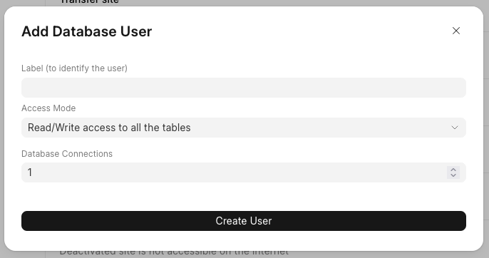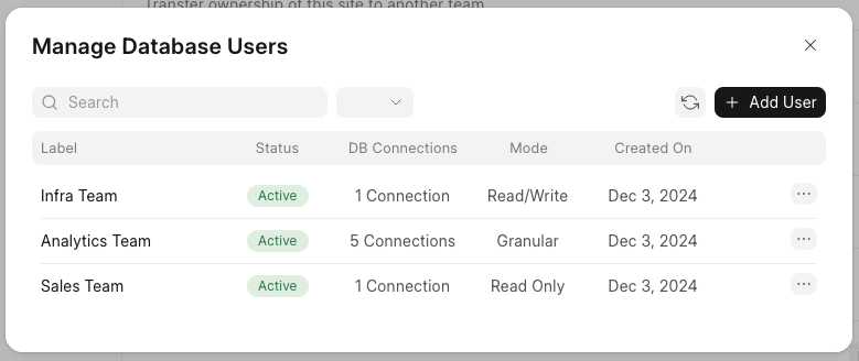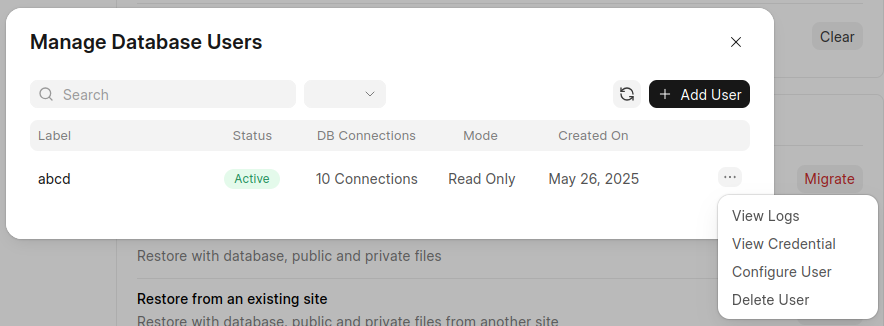 If you want to modify the permissions for a specific database user, you can easily do so by selecting the Configure User option in the row menu. This will allow you to adjust the user’s access levels and permissions as needed.