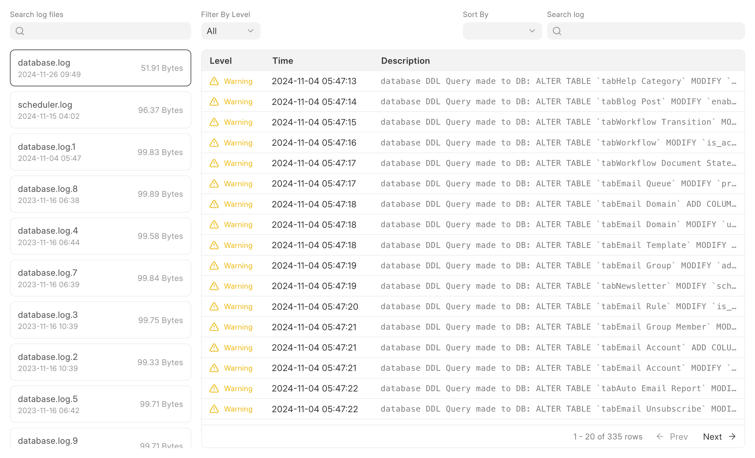 In Site mode you can view and browse through the logs generated by a site and in Bench mode you can view and browse through the logs generated by a bench (not a bench group).