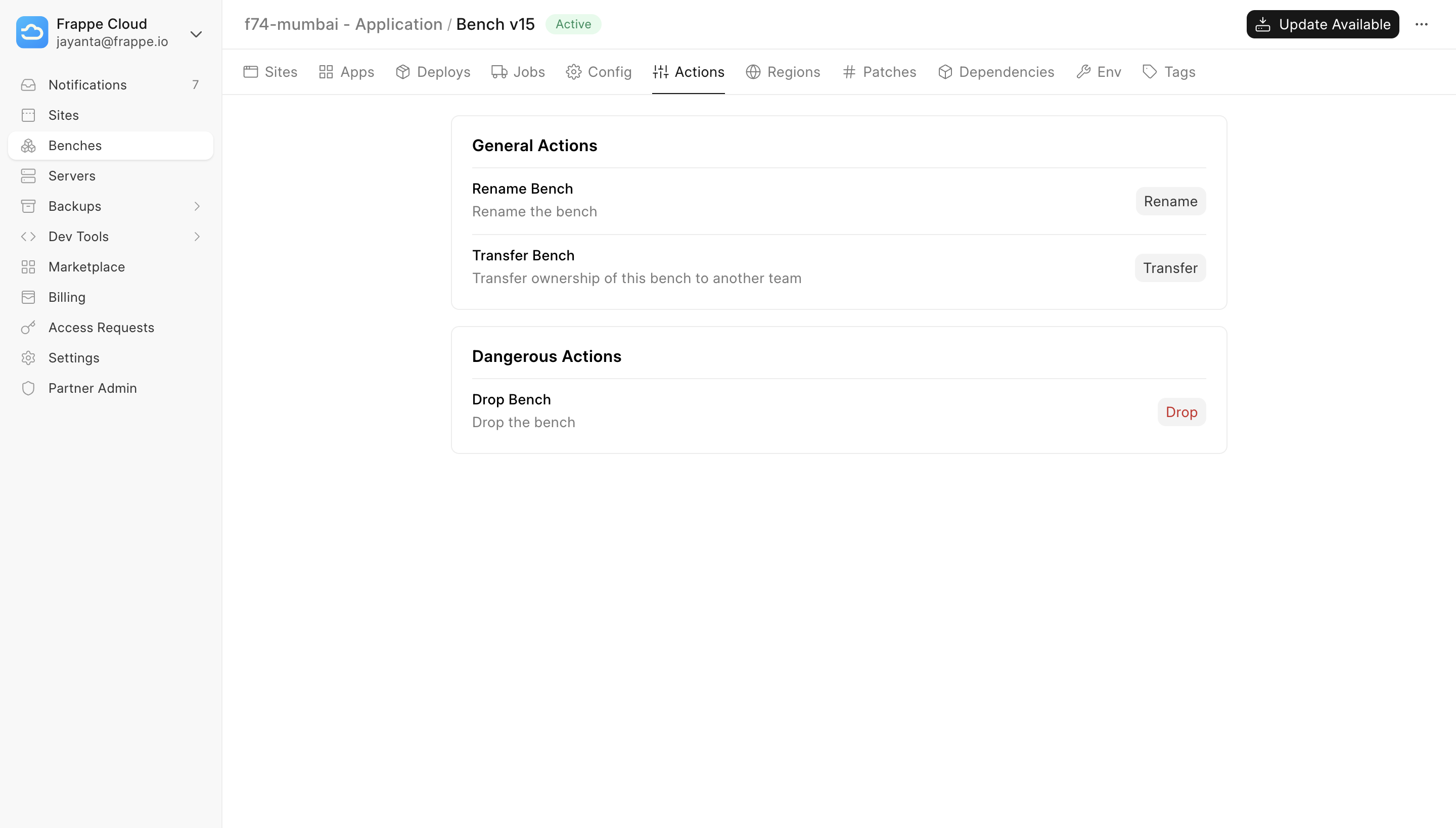 - From your Bench dashboard go to Actions > Dangerous Actions.