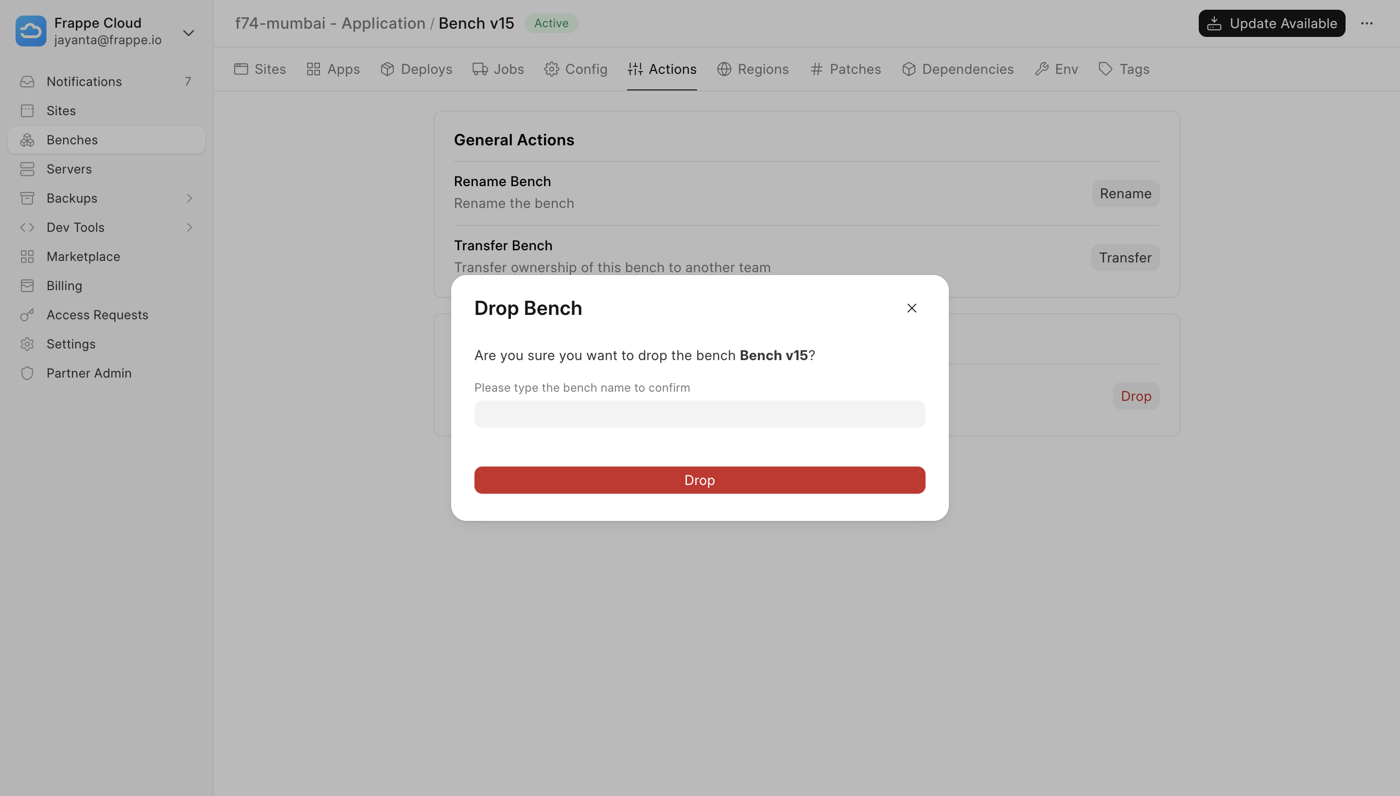 - You will be asked to confirm the name of the Bench you want to drop.