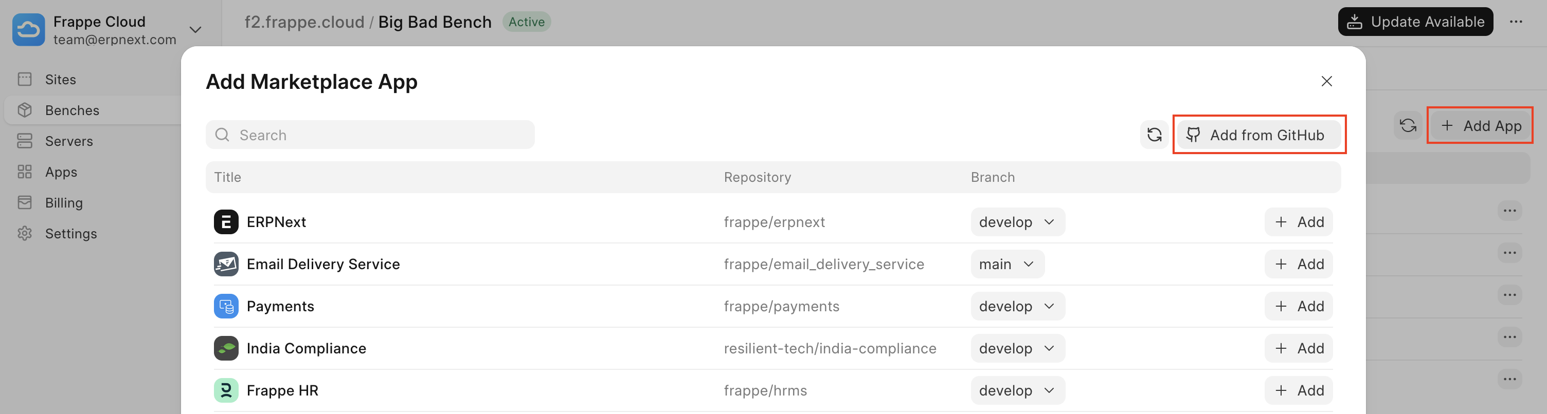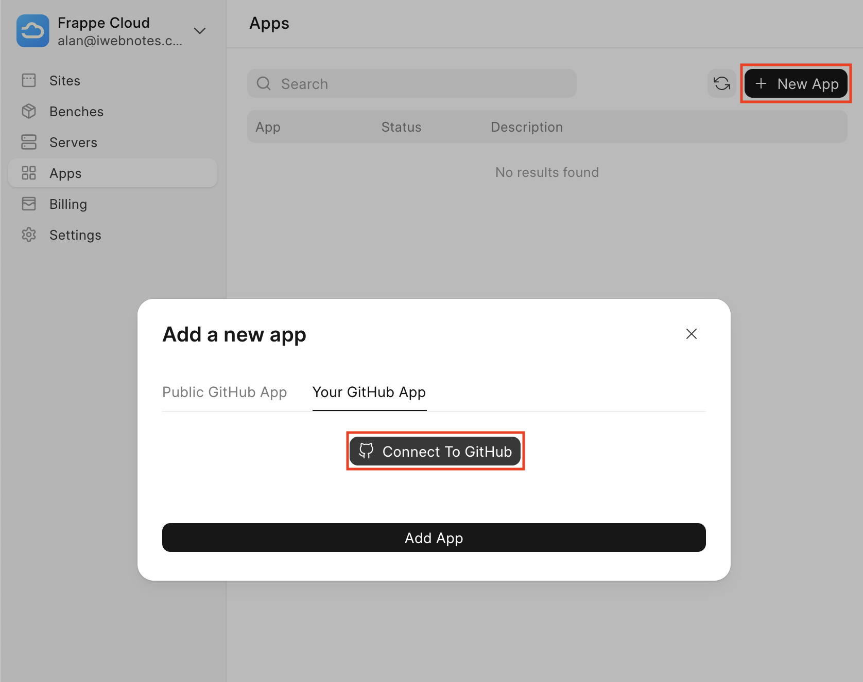 - Reinstall it by clicking on Connect To GitHub from the apps page on Frappe Cloud: