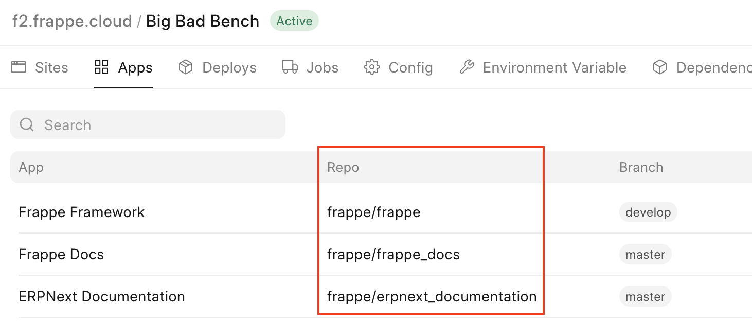 To figure out if your app has an invalid URL, navigate to Apps under your Bench Group's page and ensure that the repository path of your app is correct:
