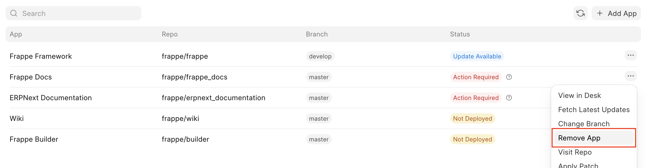 If the repository path is invalid, you can first remove the App by clicking on the three-dots menu button and selecting Remove App:
