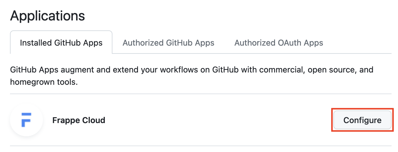 - Visit the Installed GitHub Apps page (link), and click on configure next to Frappe Cloud: