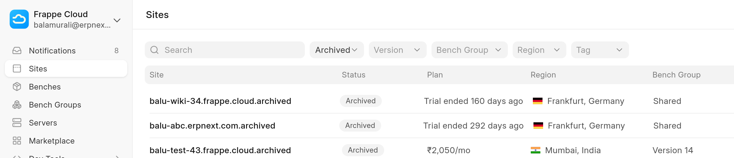 It may be the case that you dropped a site by accident or want to restore an old site. You can do this on your own from your site dashboard by setting the status filter to Archived to see a list of sites that you've dropped in the past.