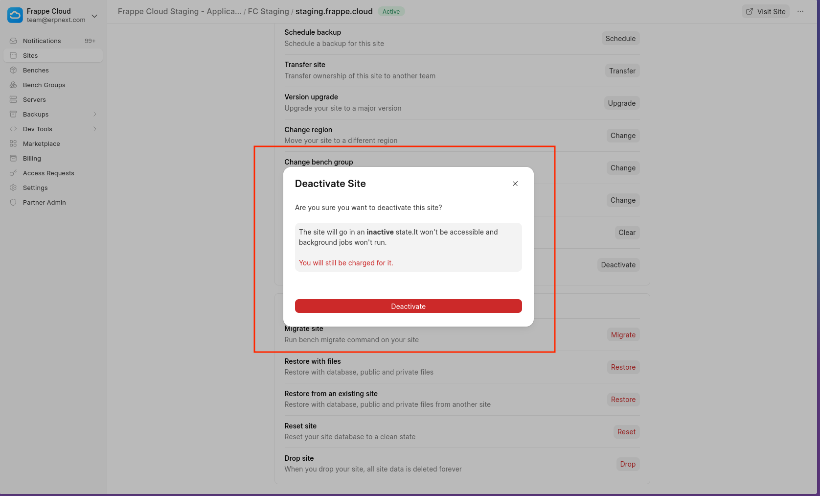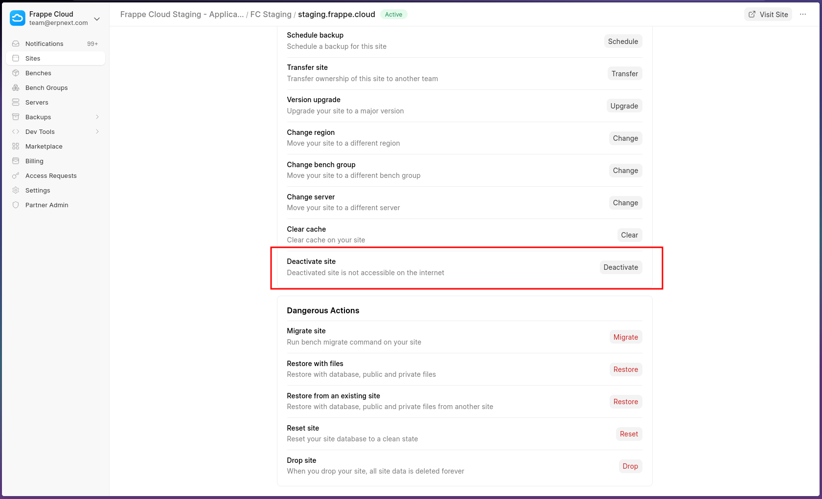 The deactivate site feature makes the site inactive and inaccessible on the internet. When deactivated the site enters into maintenance mode and the user will still be billed for the site. Please refer to the below screenshot to deactivate your site.