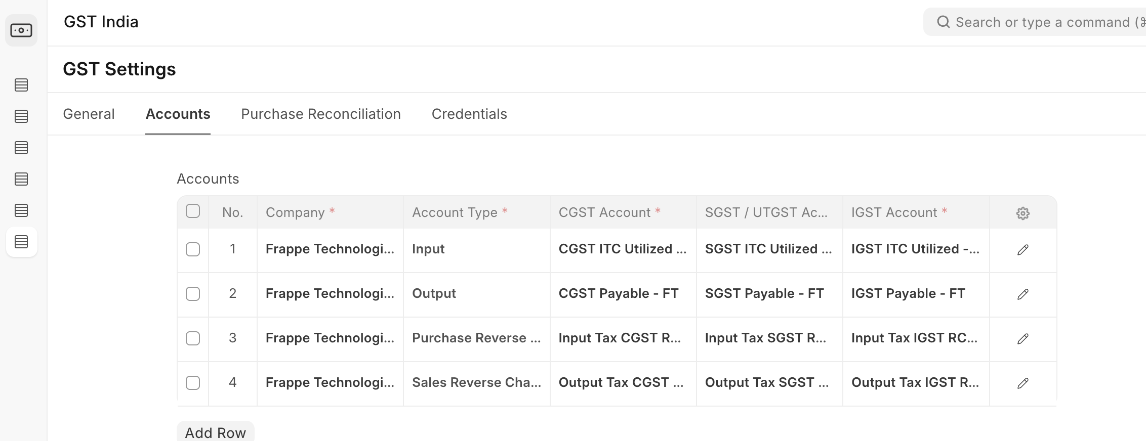 The final goal for tax ledgers is to provide reports as specified by the tax authorities. While tax ledgers are created in the Chart of Accounts, the system needs a setting to identify which ledger corresponds to which tax type. The India Compliance app, for example, has a GST Setting page for this.