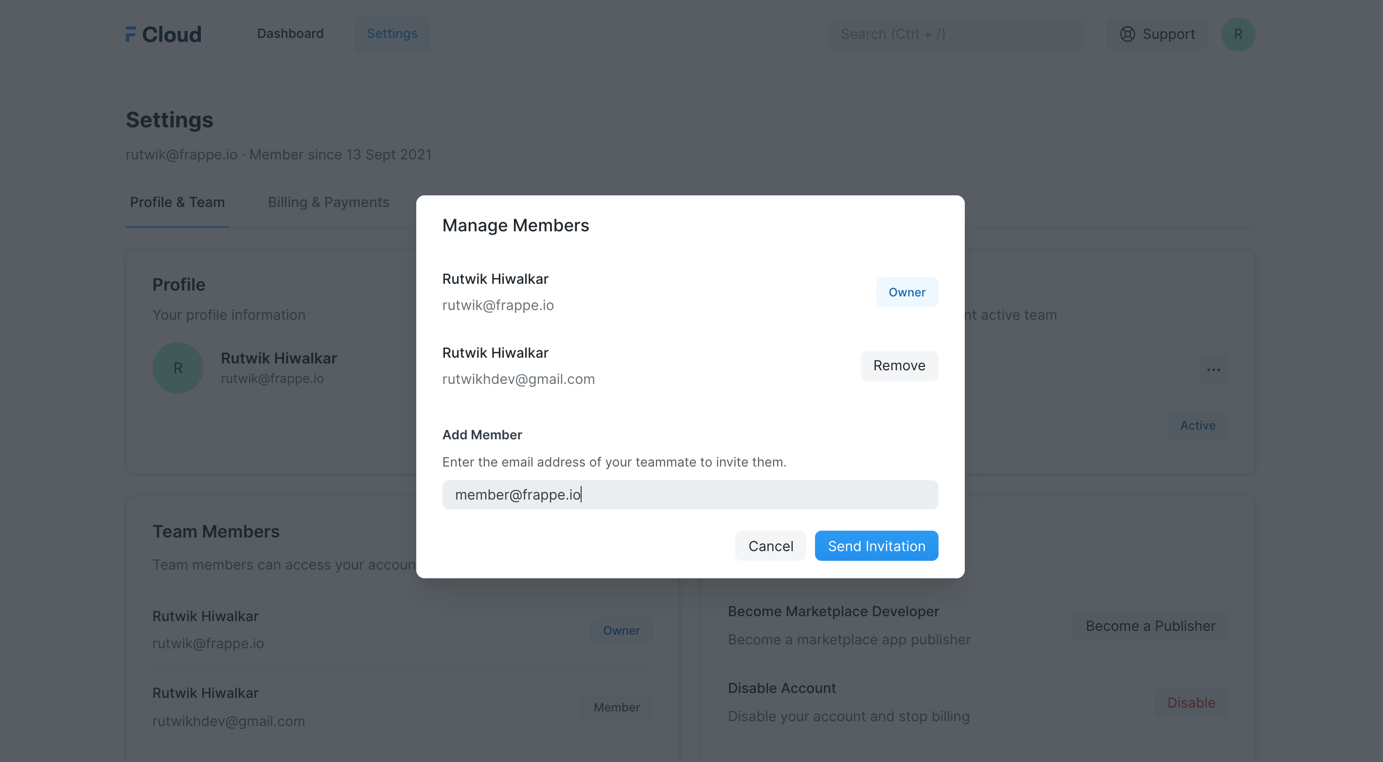 When you signup with Frappe Cloud we create a team for you by default. You can add or remove members from this team.