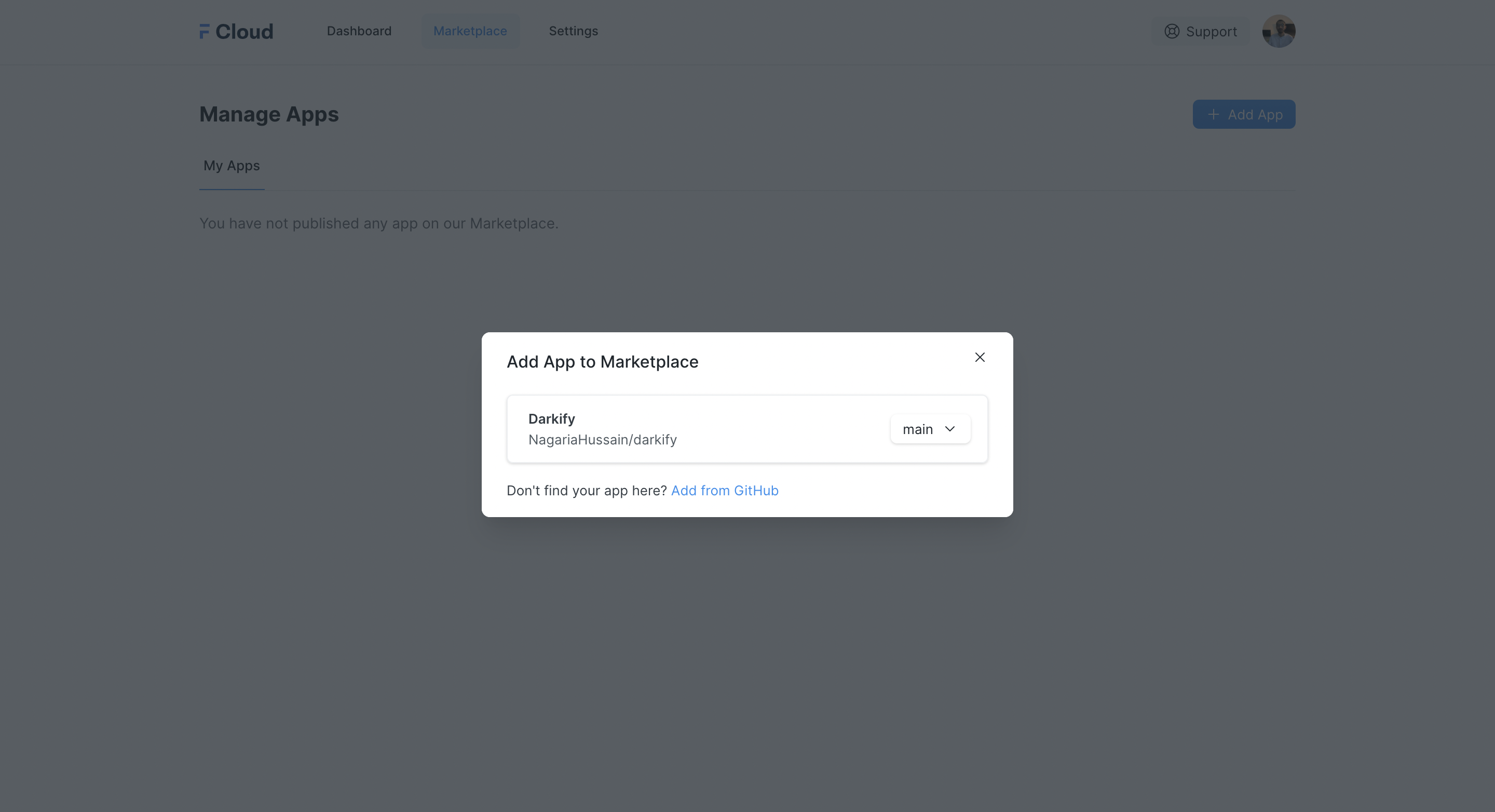 Select the app you want to add to the marketplace or if you want to add an app from GitHub, click on the Add from GitHub link.