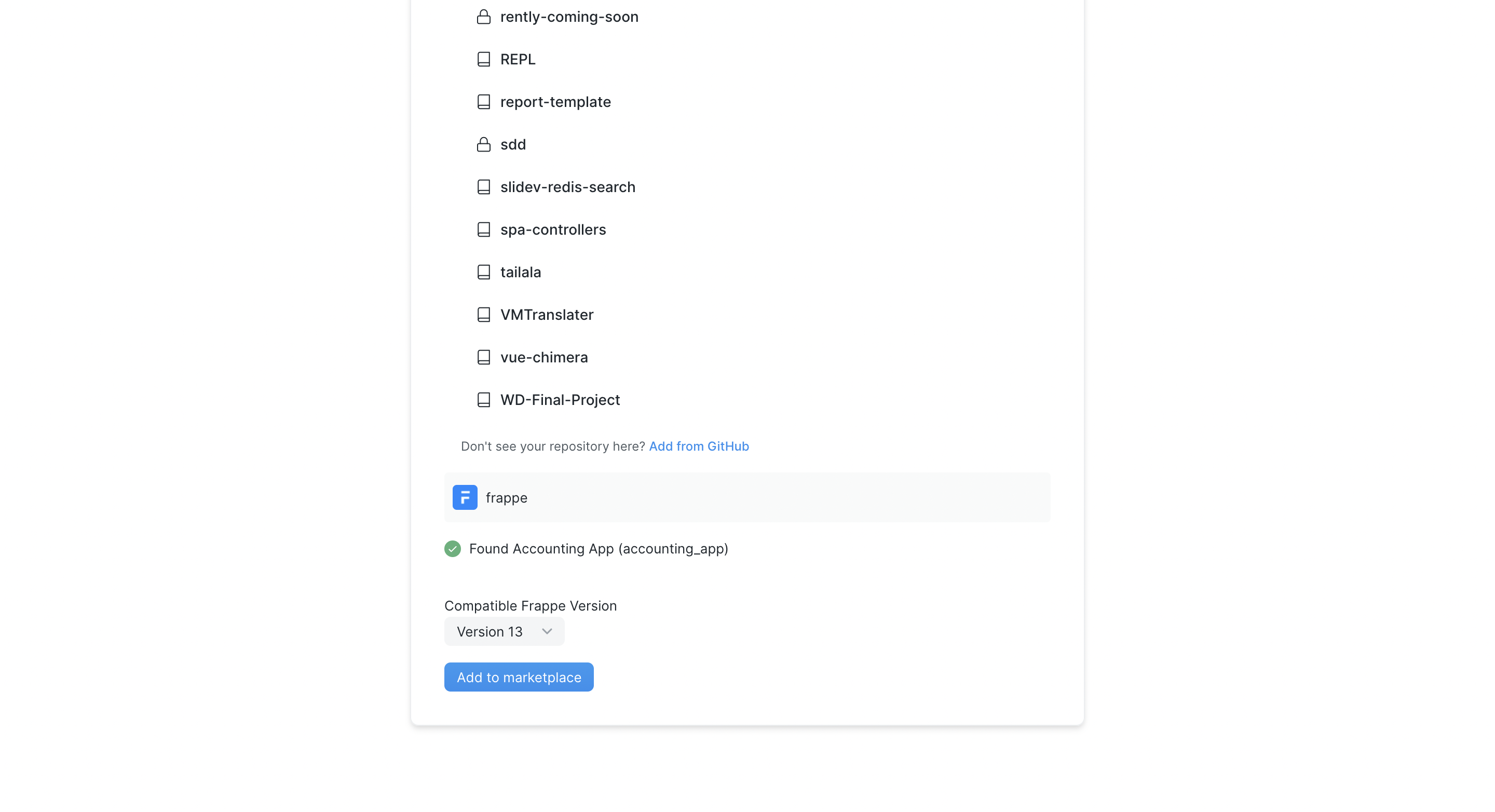 GitHub account. Once your app is validated, you can select the version of Frappe with which your app is compatible and click on