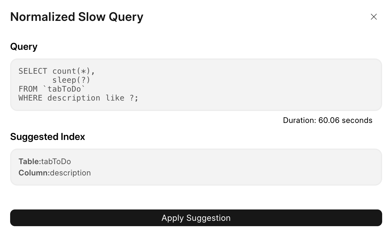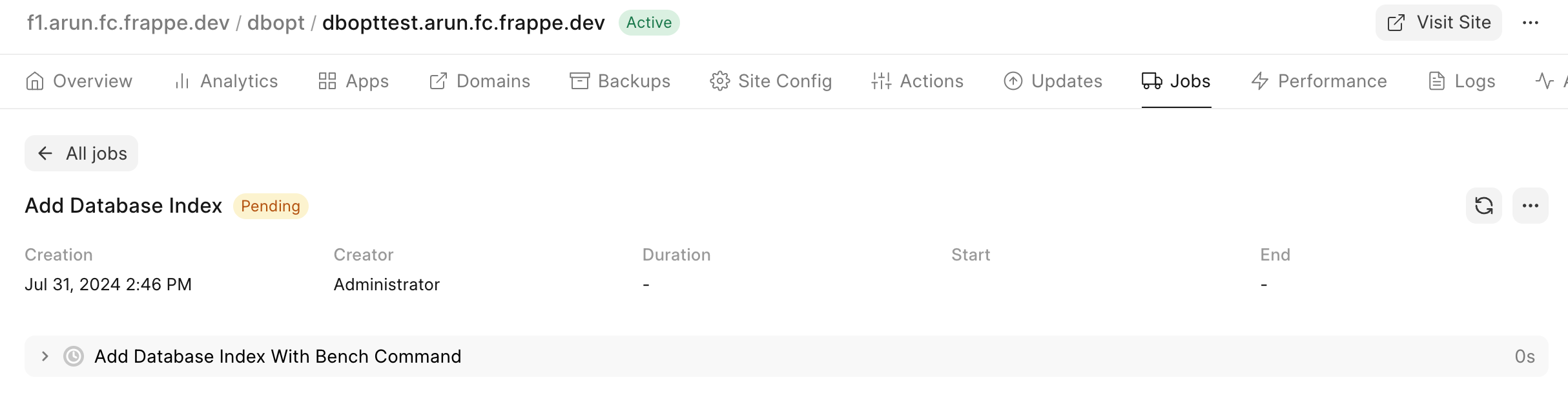 - Click on Apply Suggestion to add the suggested index. This will create an "Add Database Index" job, whose status you can track from the jobs tab.