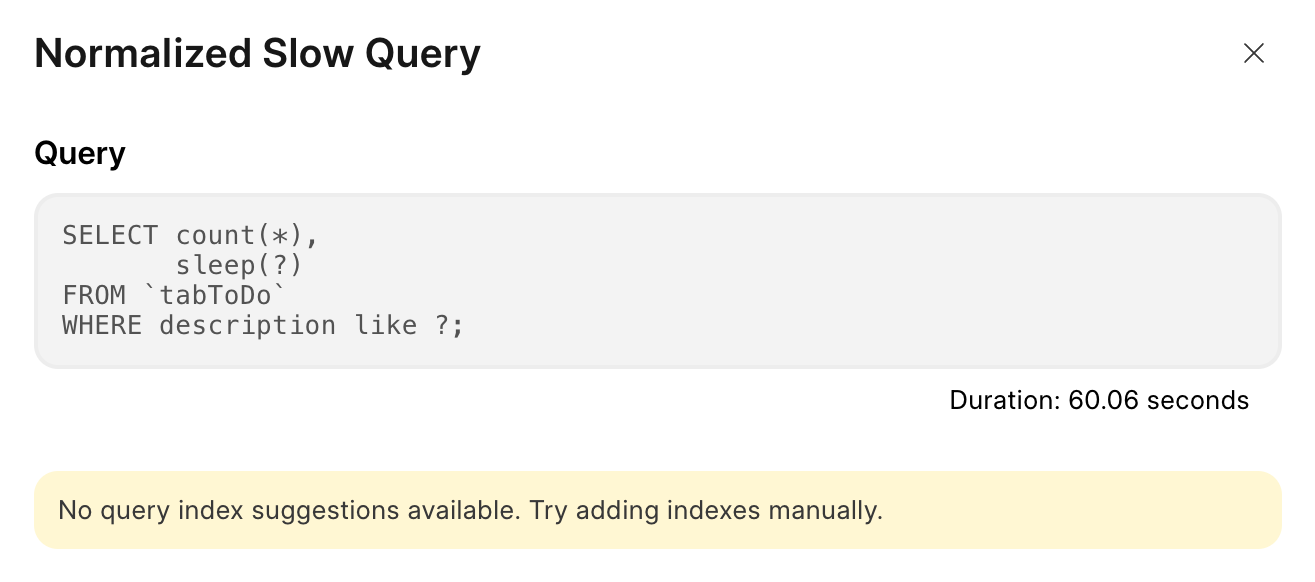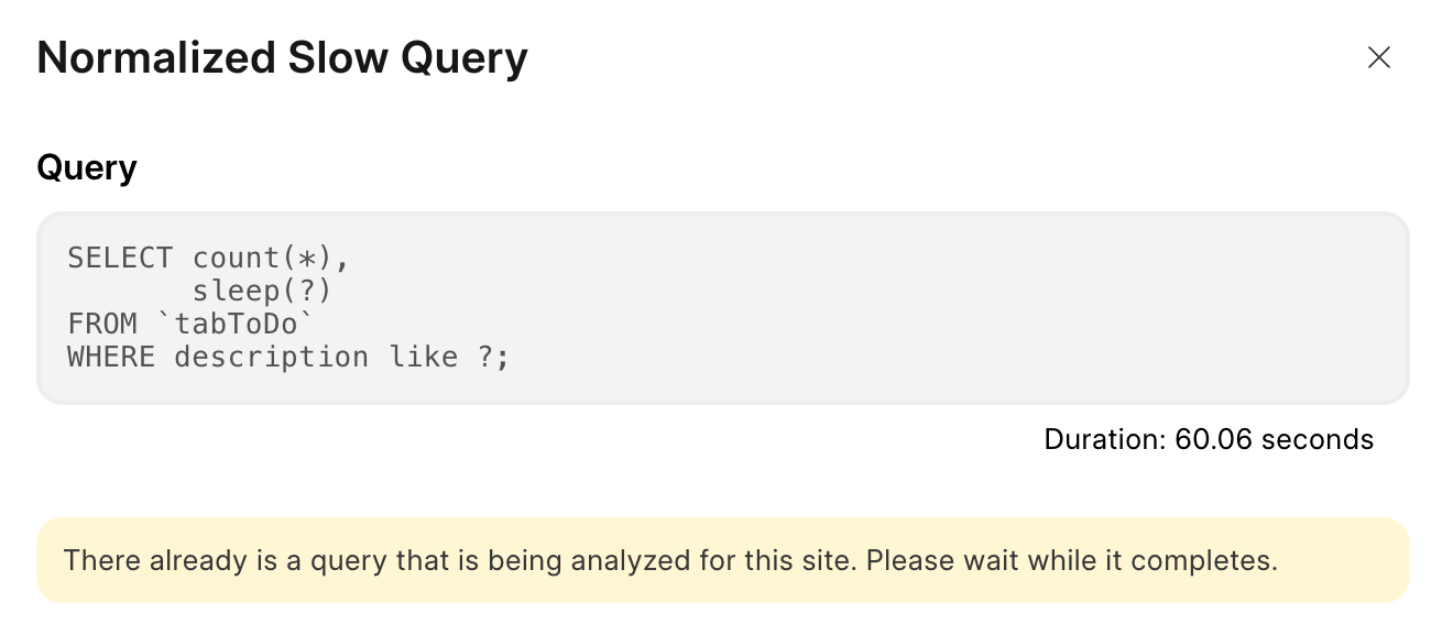 - Click on the row containing the query you would like to analyze and the Normalized Slow Query dialog should open.
