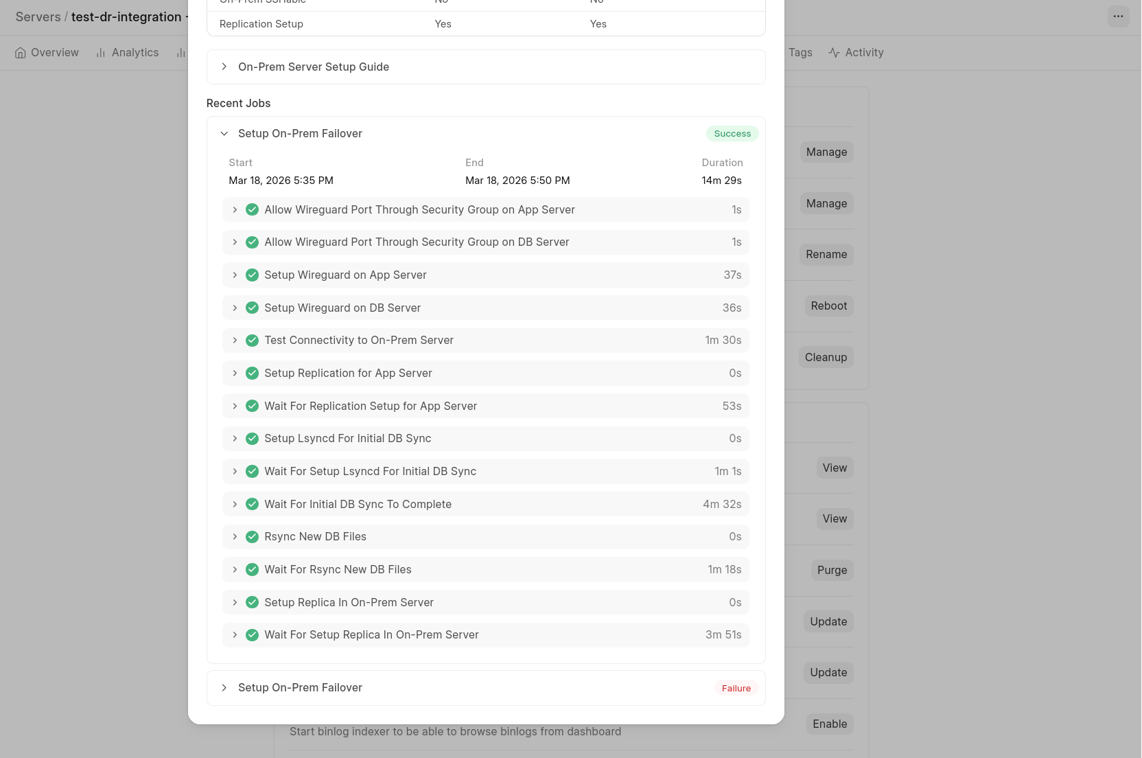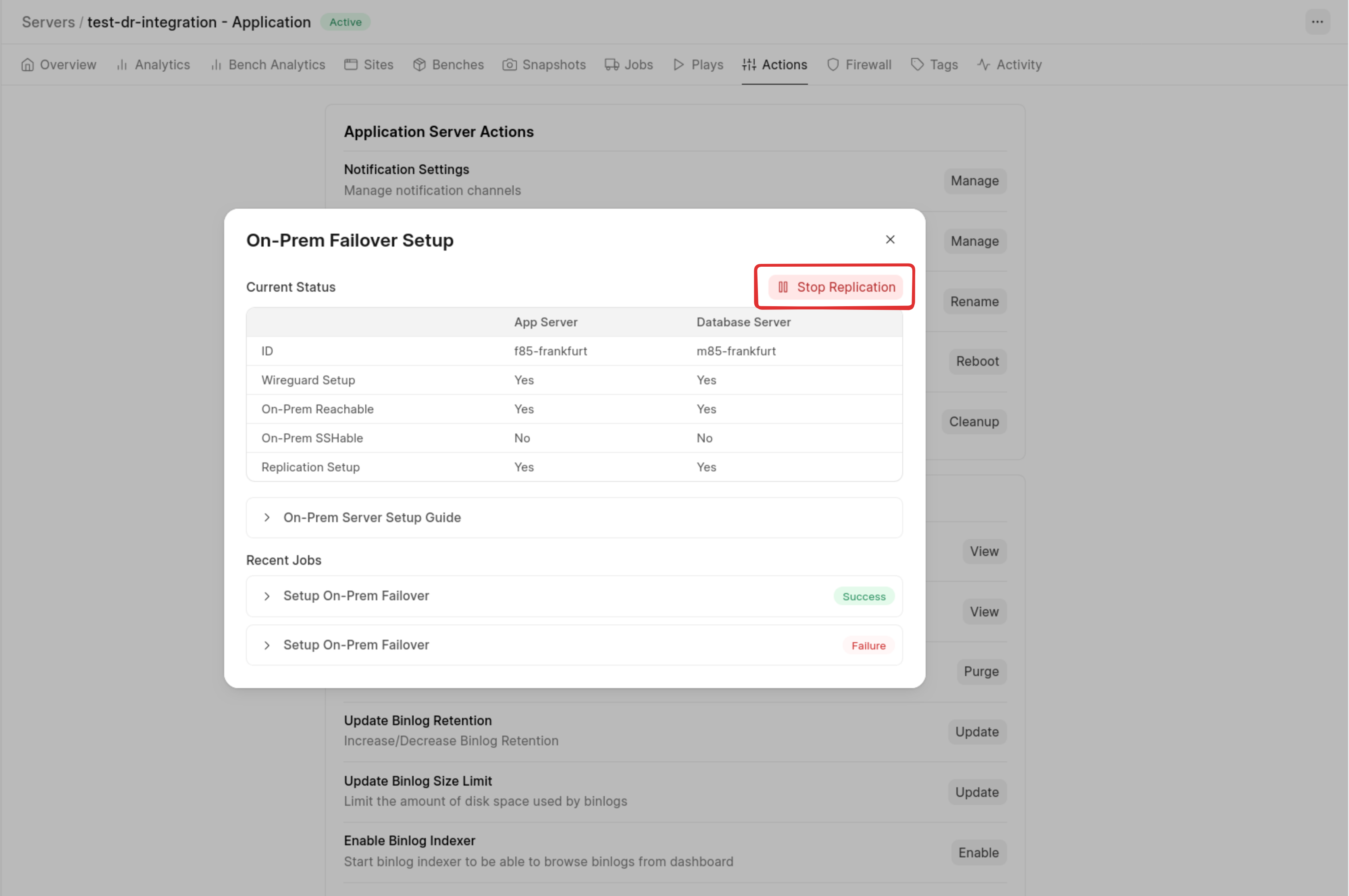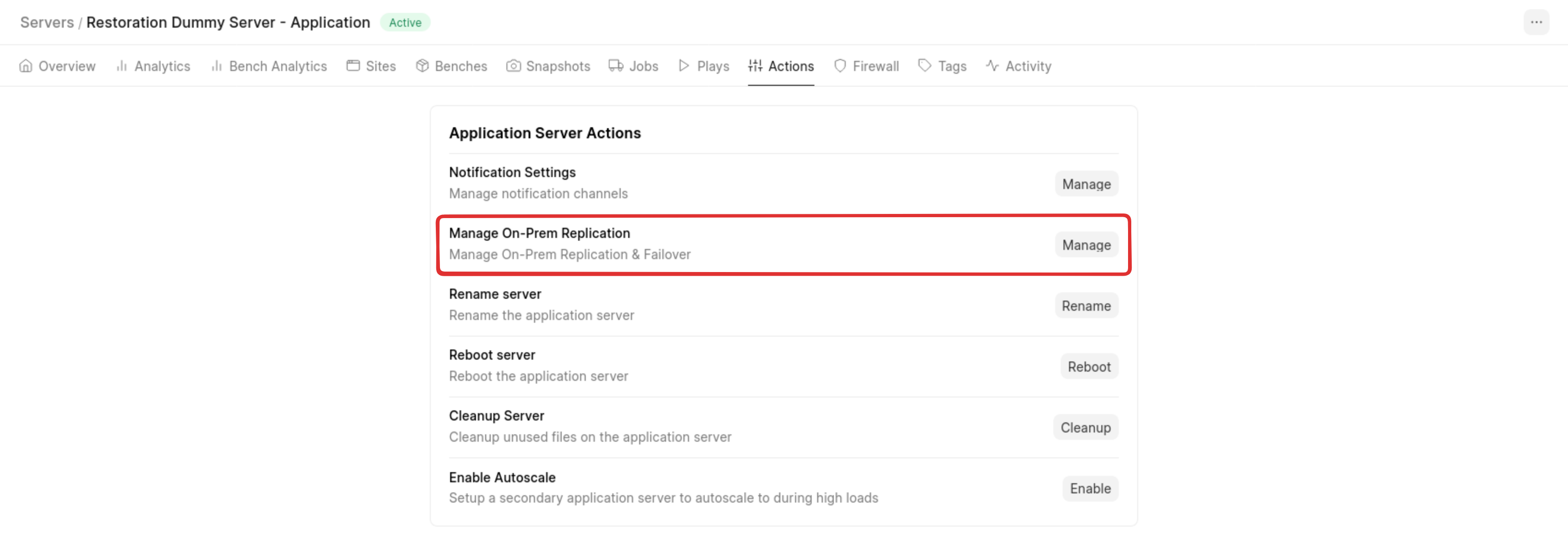 Once support enables the feature, you will see “Manage On-Prem Replication” under server actions.