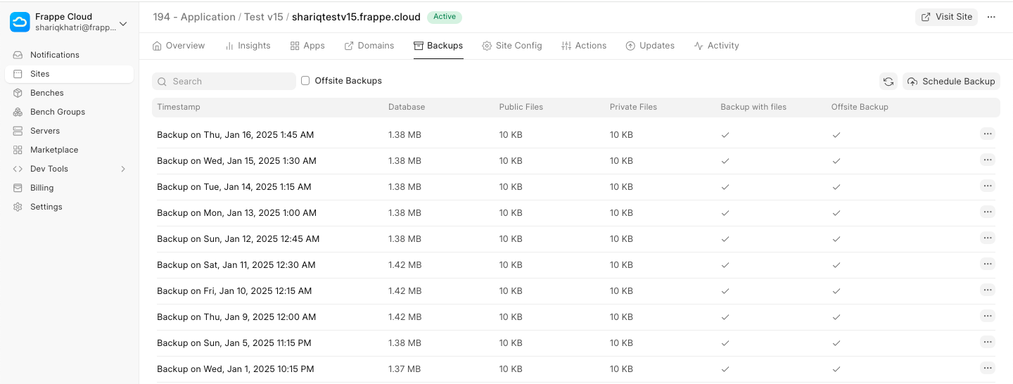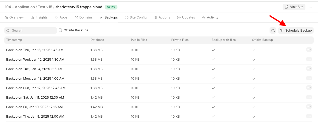 From the Frappe Cloud site dashboard, go to the Backups tab. Here you will see the list of backups that were taken of your site. Every backup consists of a database backup, public files backup and private files backup.
