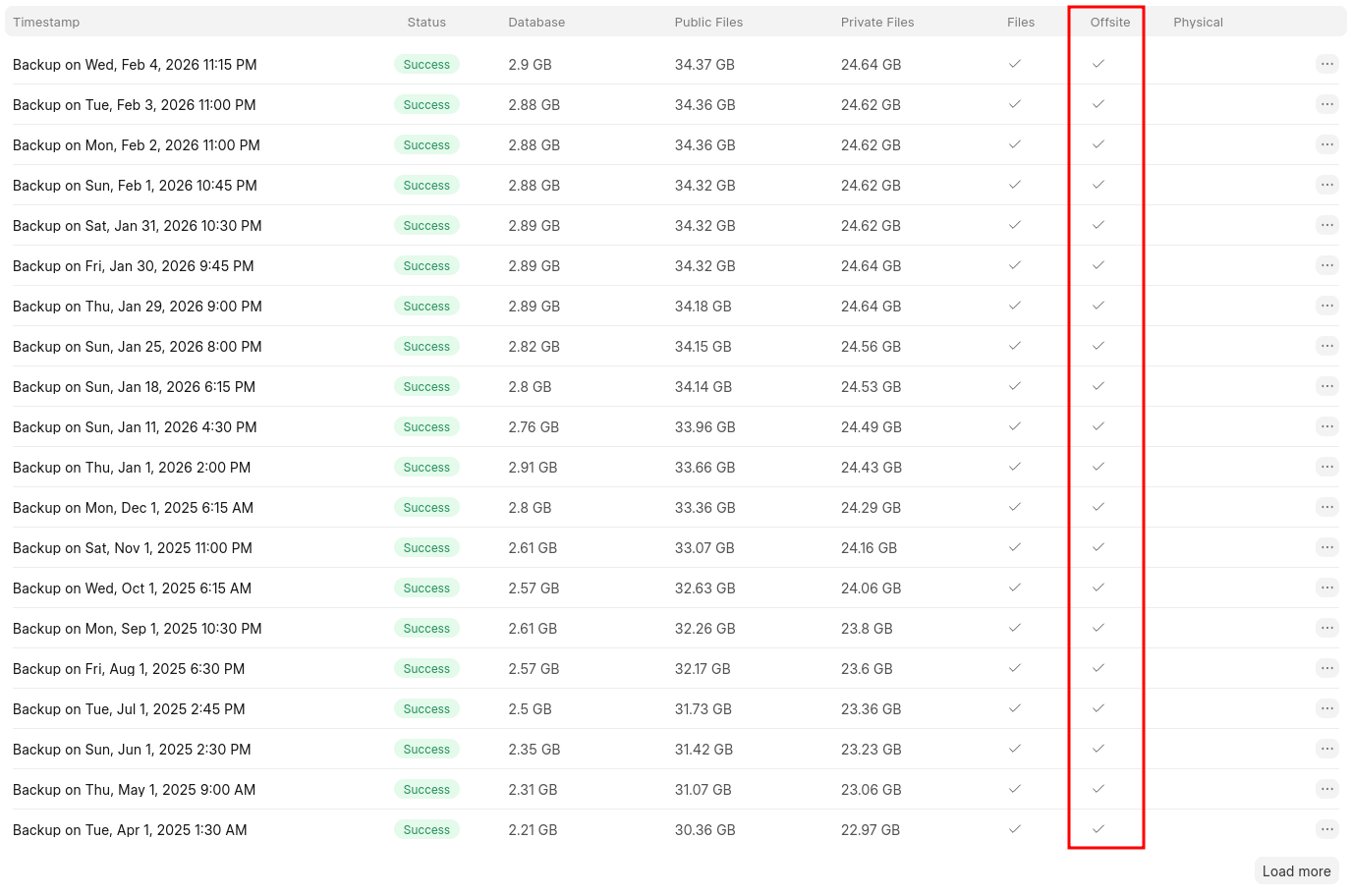 Offsite backups are marked as such in the Backups tab.