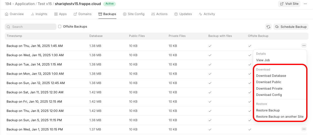 Only the backup marked as "offsite" can be downloaded directly from Frappe Cloud dashboard