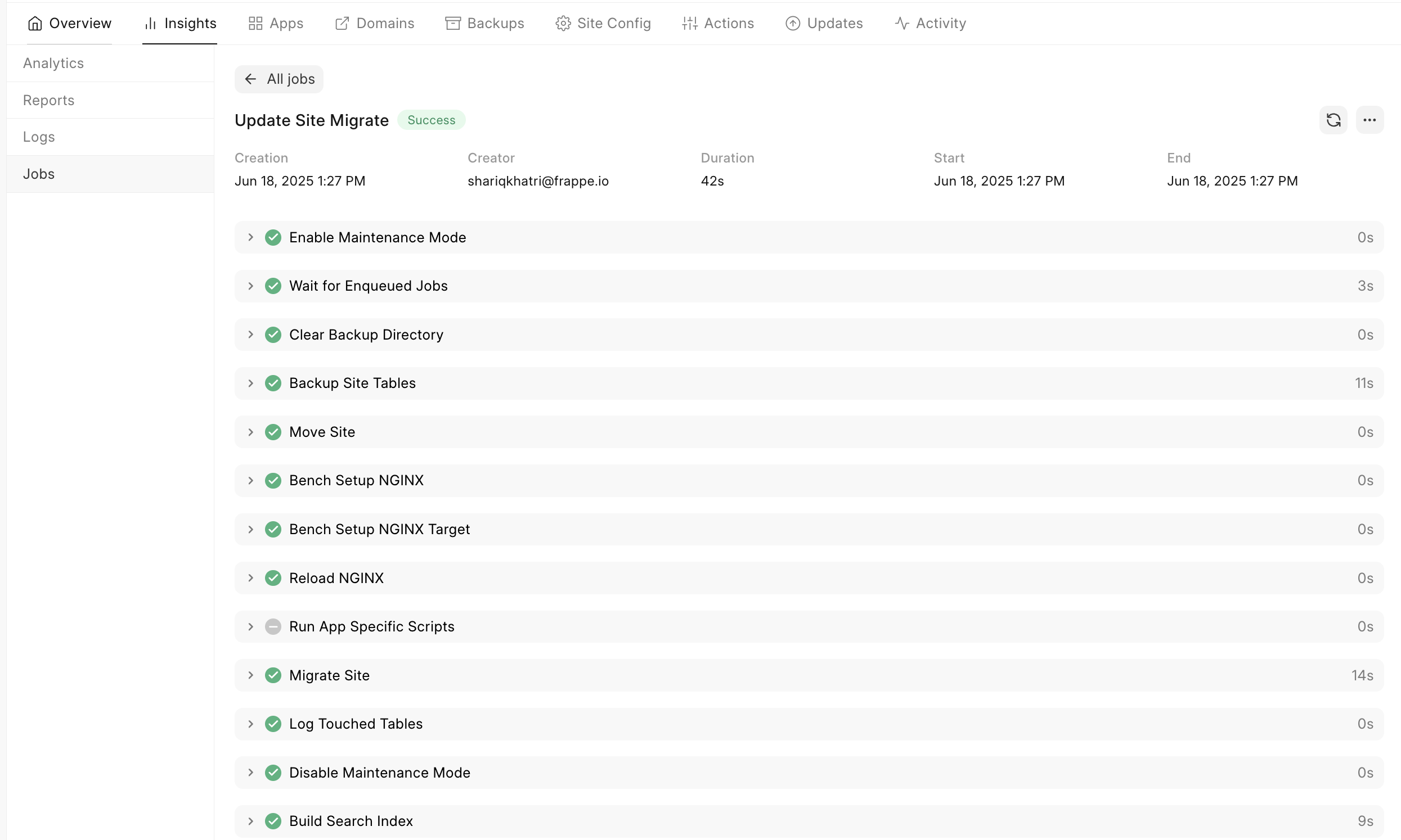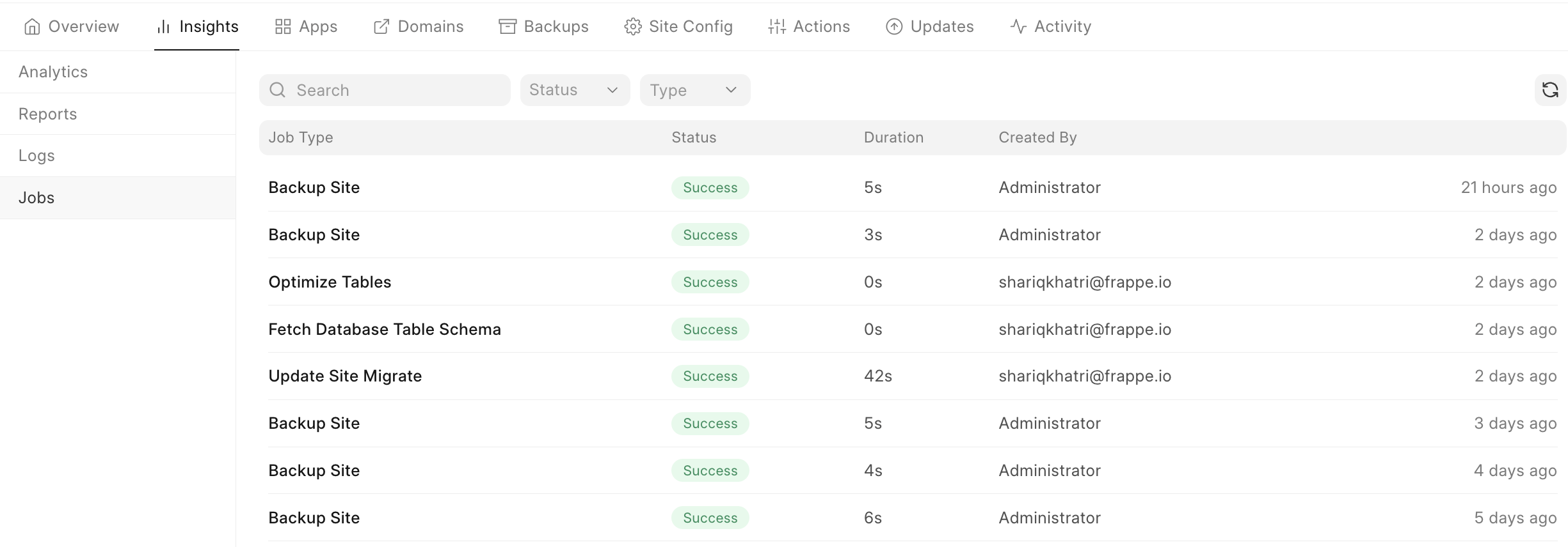 Every action such as site creation, adding a custom domain, scheduling a backup, updating site configuration, etc. is tracked here. For e.g.,