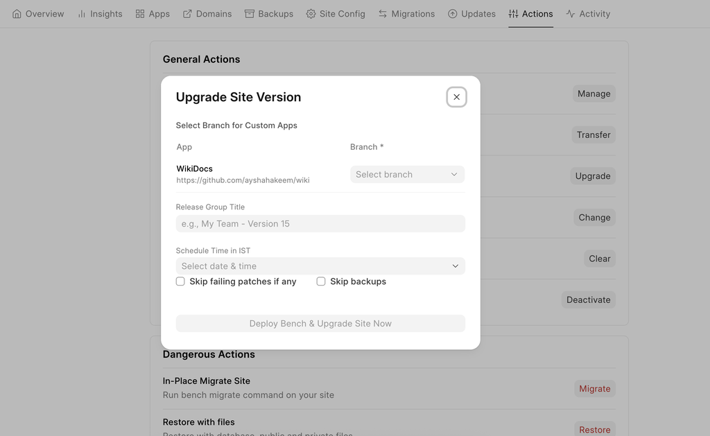 - If you have any custom frappe apps on your bench group, you will be prompted to select the branch.