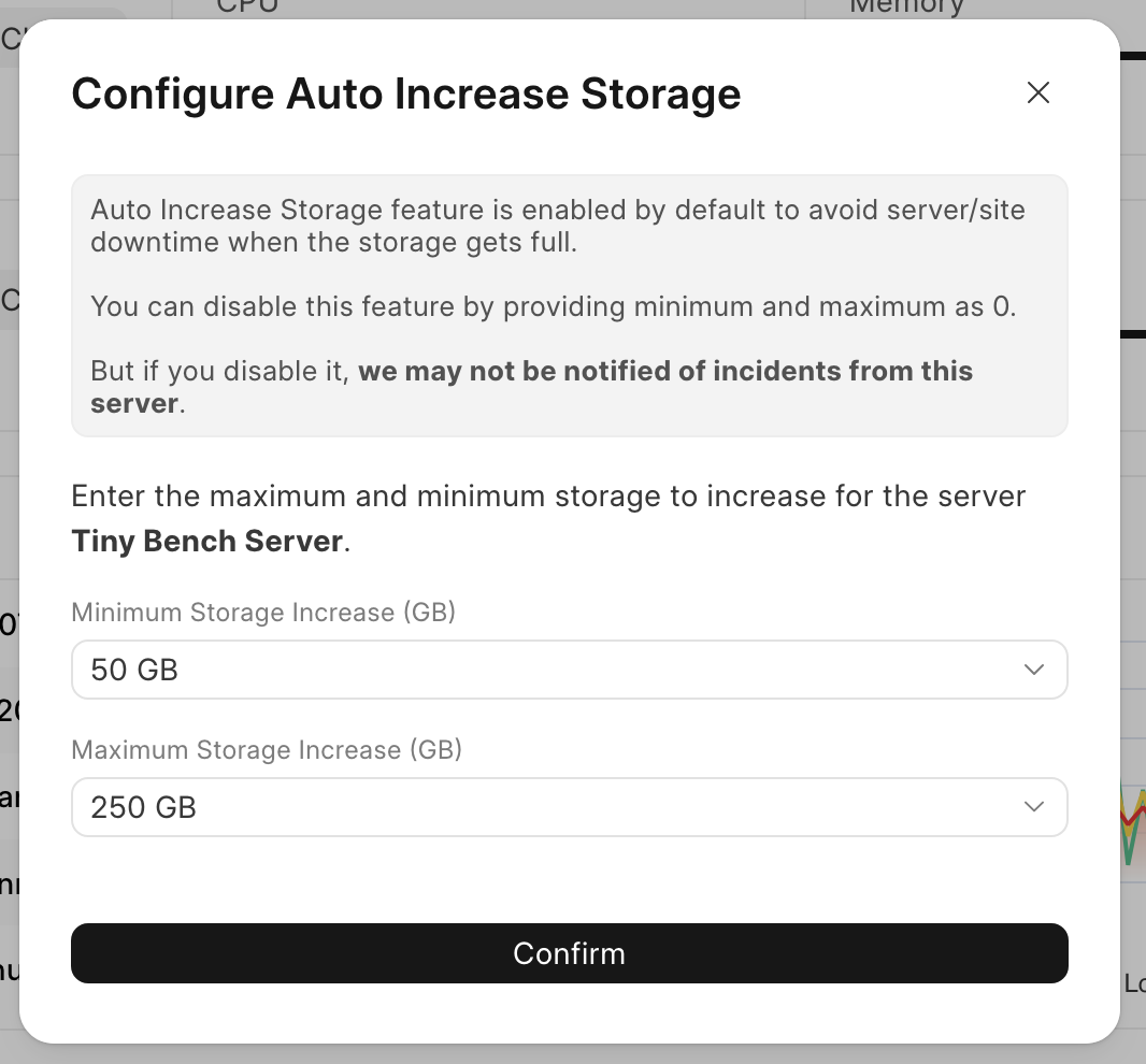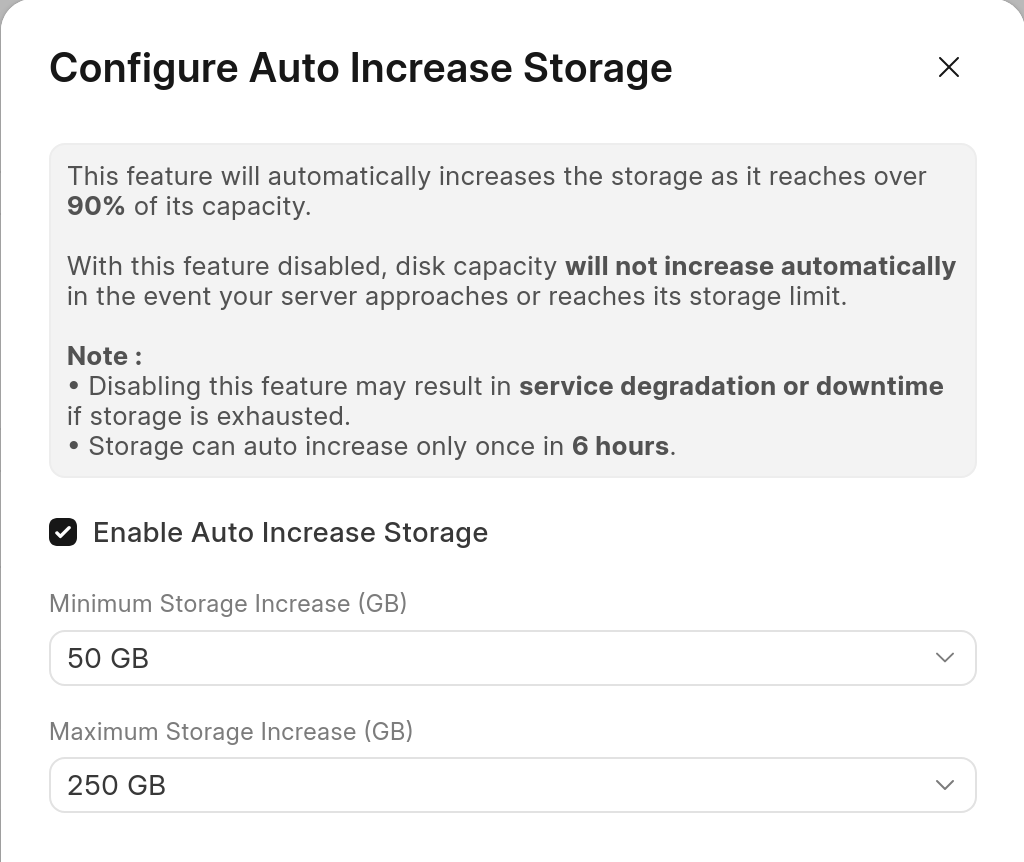 Before the addons were introduced, Frappe Cloud itself was handling the additional storage being added on the server. The system automatically adds additional storage as and when required in order to prevent downtimes and other issues (mainly redis) from happening. If you wish to opt-out of this feature, you can disable it following the below steps. Note that if you do choose to do this, the downtimes on the server will be ignored by the system.