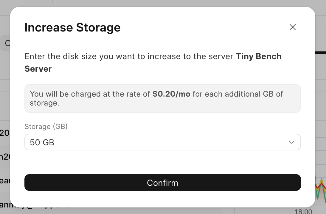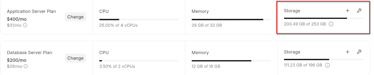 In case the base storage included in the Server's plan is not enough, you can always add more storage to your server as required at an additional cost of $0.2/GB per month. Note that AWS does not allow us to revert the storage added to a volume. So, if it turns out that you don't need the additional storage that's been added to your server, you can create a new server and move your sites over to the same.
