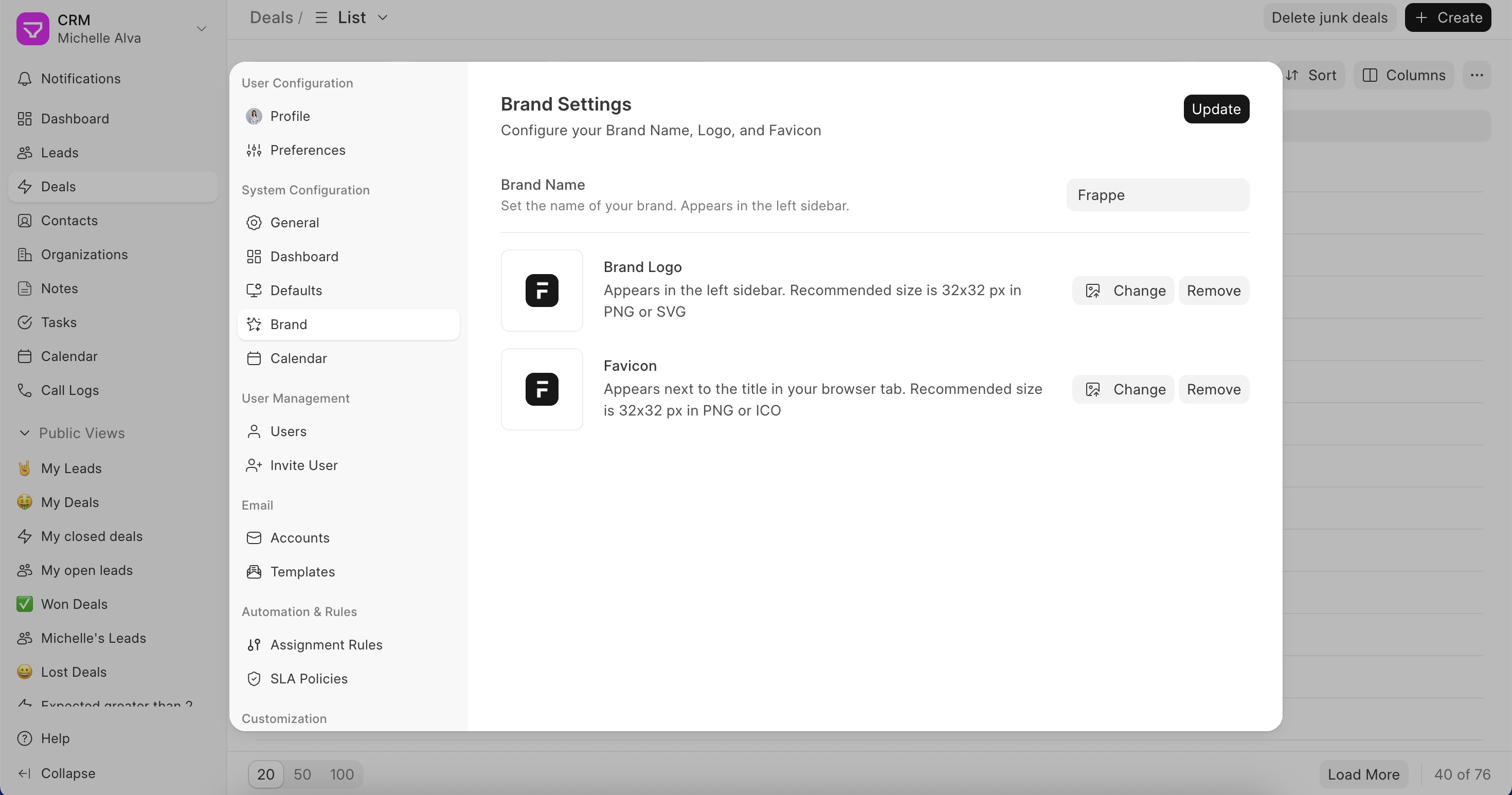 If you're setting up Frappe CRM for your company or a client, you can replace the default Frappe branding with your own. Change the name, logo, and favicon and it'll feel like your own CRM.