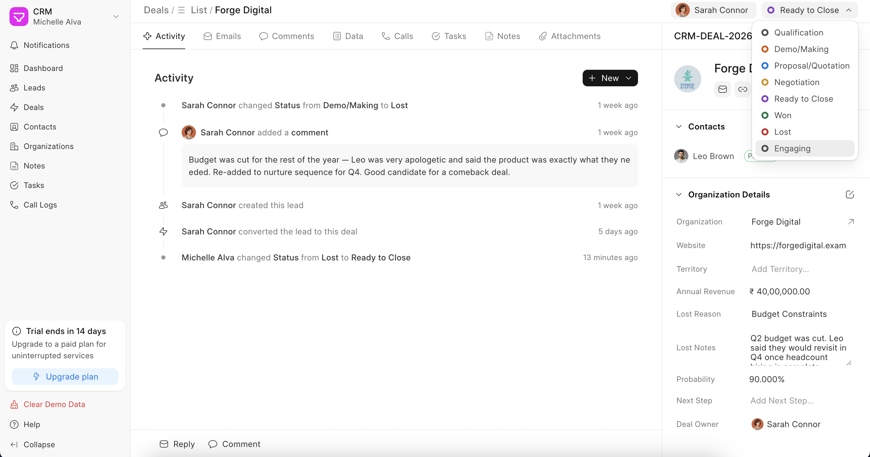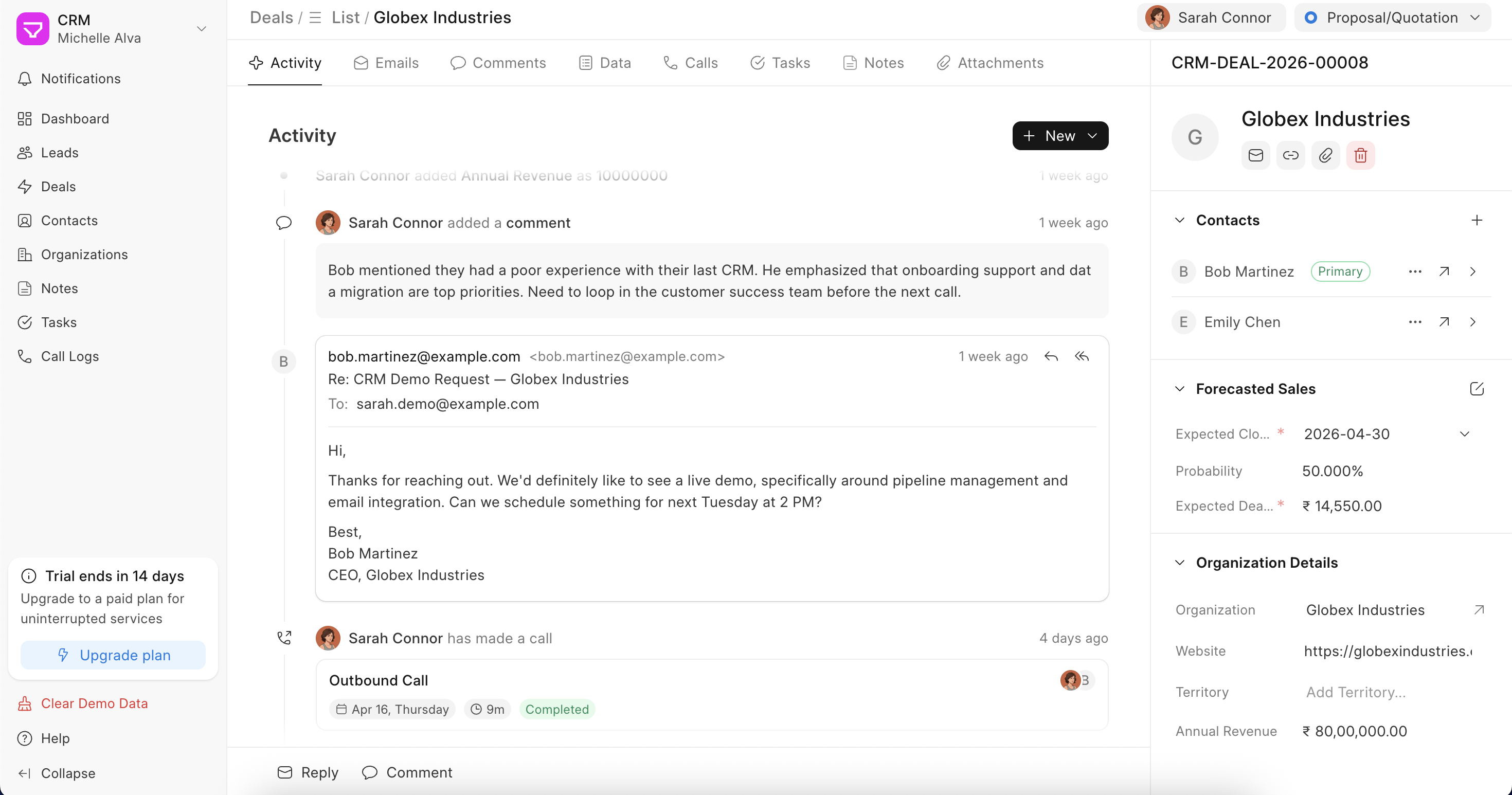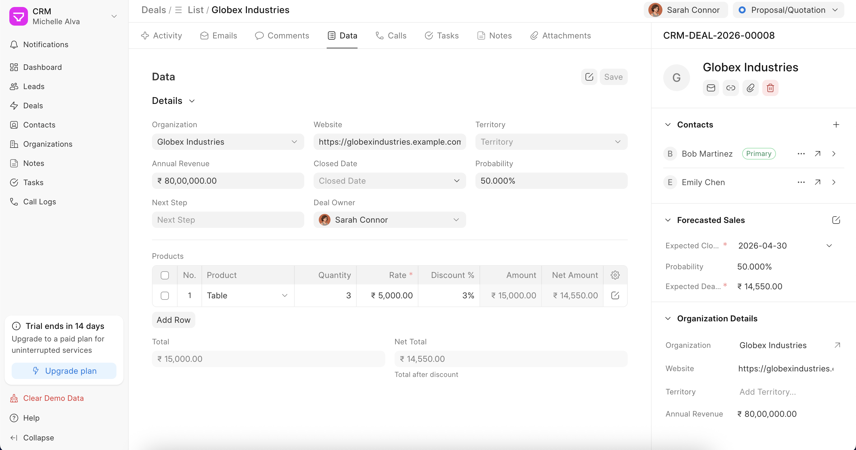 - Organization Details – The organization linked to the deal, along with website, territory, annual revenue, and deal owner