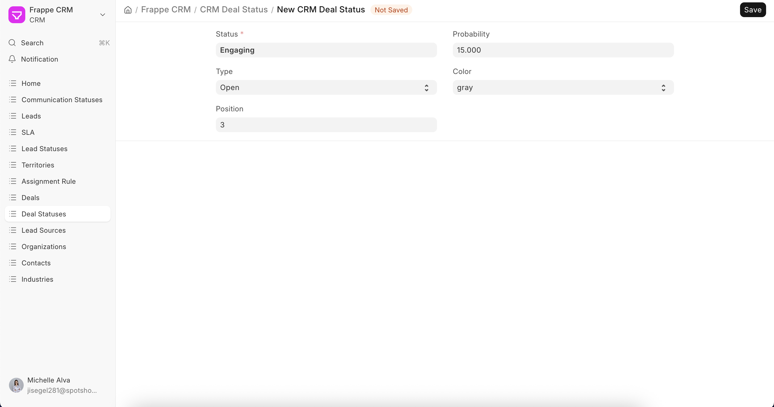 At the top, you'll also see the Deal status. Some of these statuses are available out of the box. If you want to add custom statuses, you can add them by going to the Desk view (more details ++read here++) and searching for CRM Deal Status. Add the status of your choice, choose the type, and click on save. The Deal status helps you visualize your Deals through a pipeline.