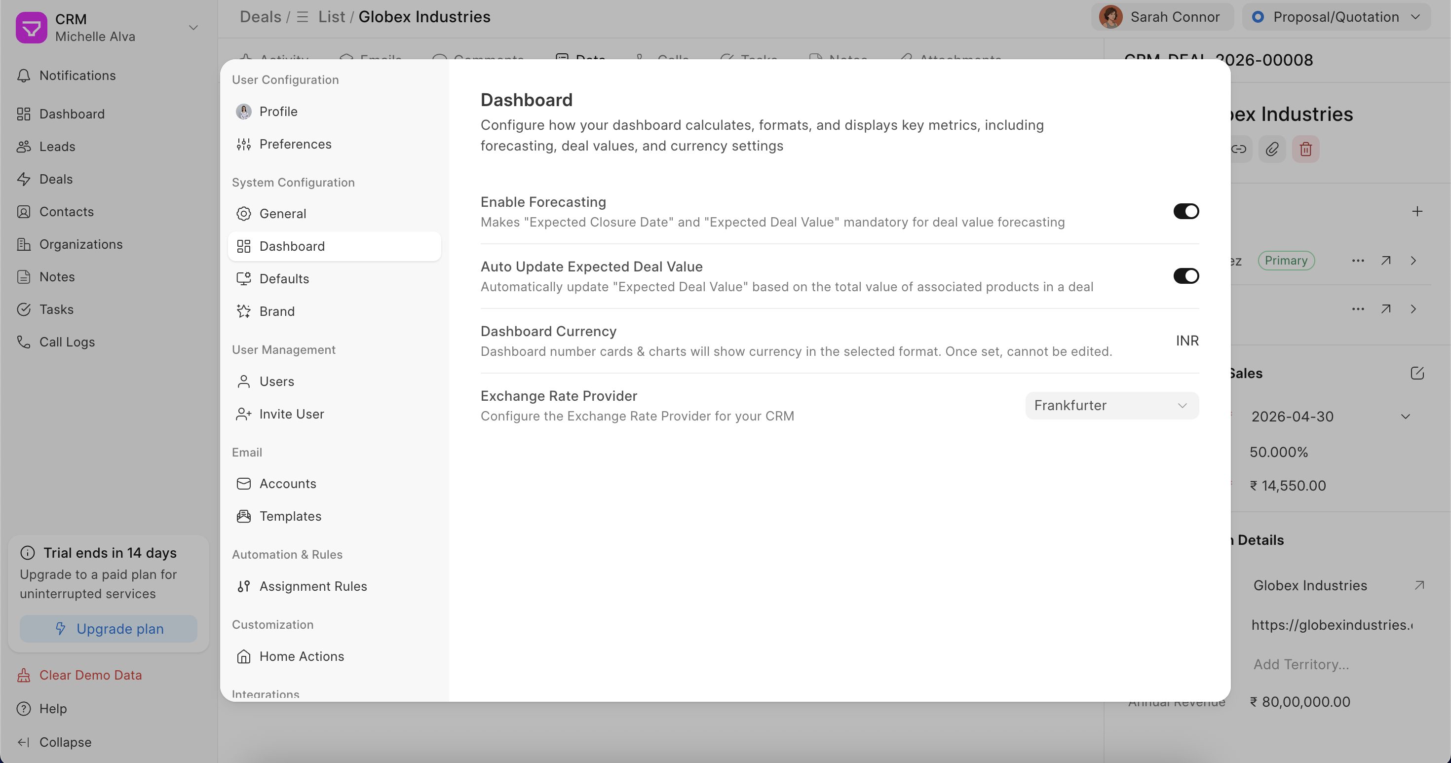 If you want to forecast revenue across your pipeline, go to Settings > Dashboard and enable the Enable Forecasting toggle. This makes the Expected Closure Date and the Expected Deal Value mandatory on every deal. You can also turn on Auto Update Expected Deal Value to have it calculated automatically from whatever you've added to the Products table.