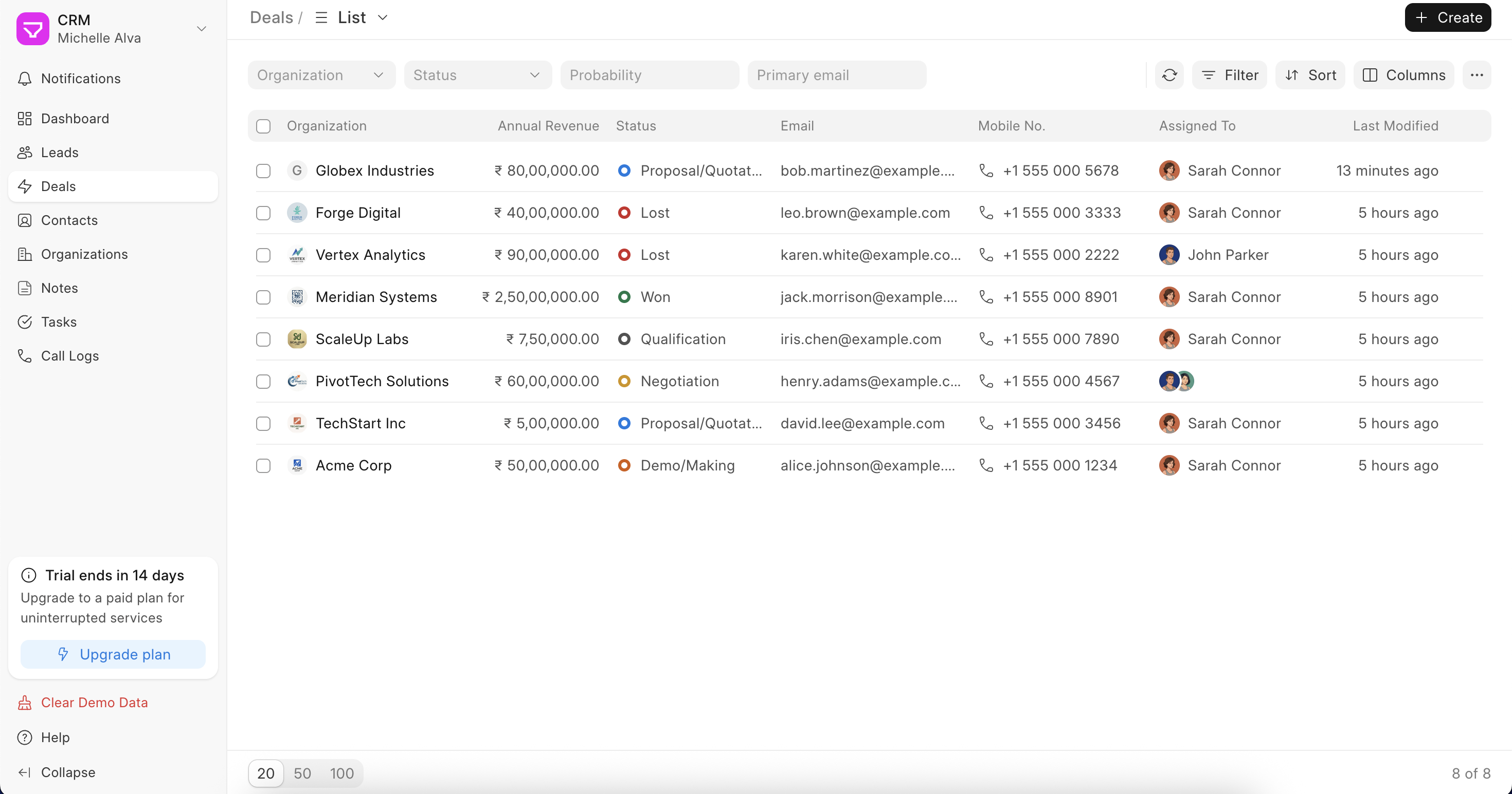 The Deals list works just like the Leads list. Each row shows you the organization, deal value, status, email, phone, who it's assigned to, and when it was last updated.