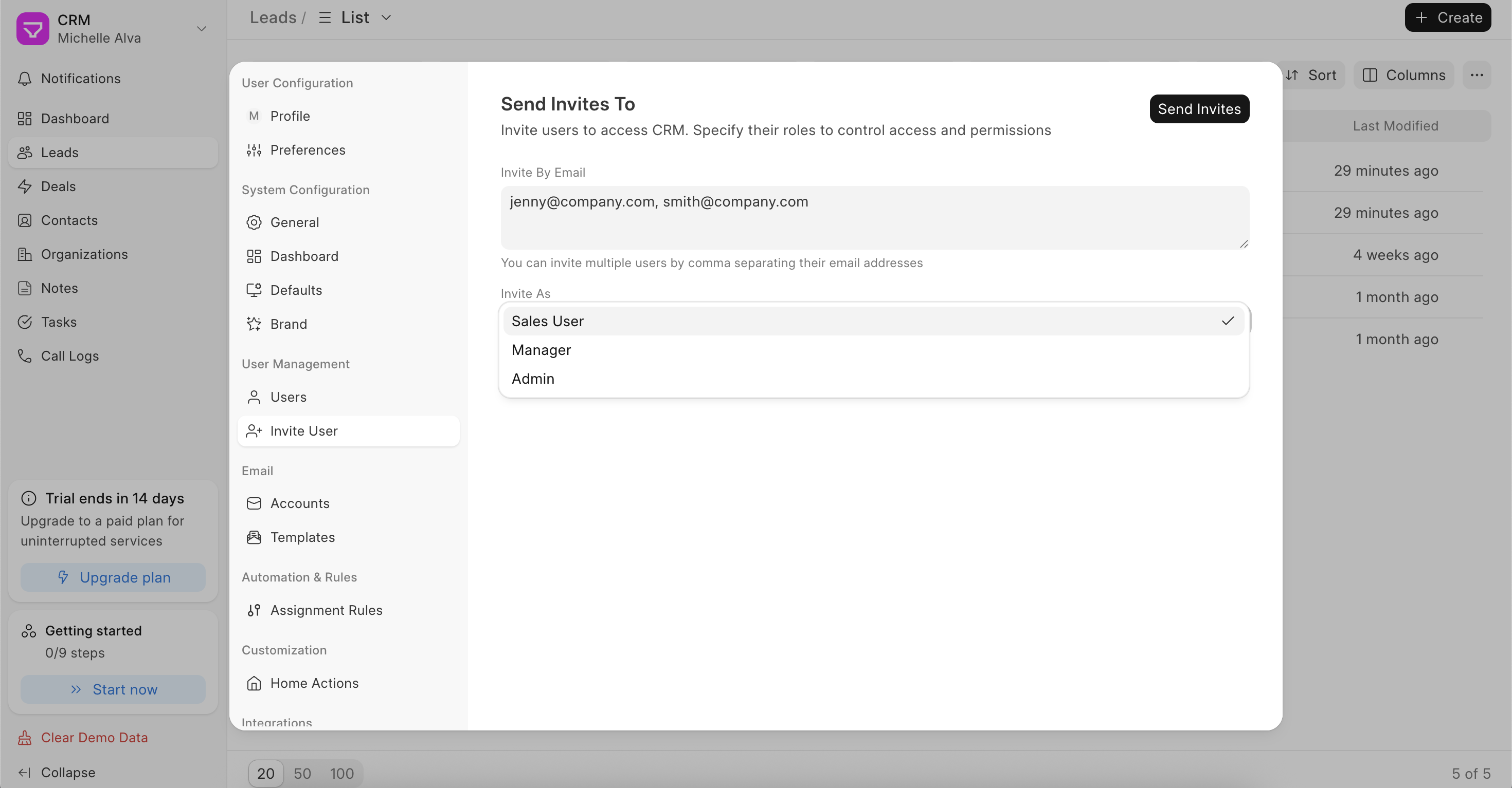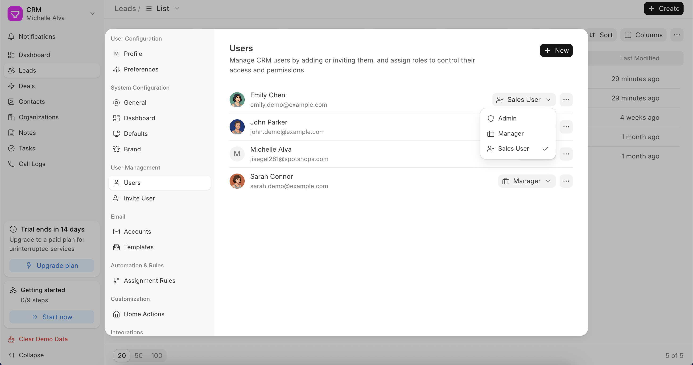 Existing site users – If someone already has an account on your Frappe site (maybe they use another Frappe app like HRMS or Helpdesk), they're not automatically part of the CRM. You can add them directly from Settings > Users without sending a new invite. Just add them and assign a role.