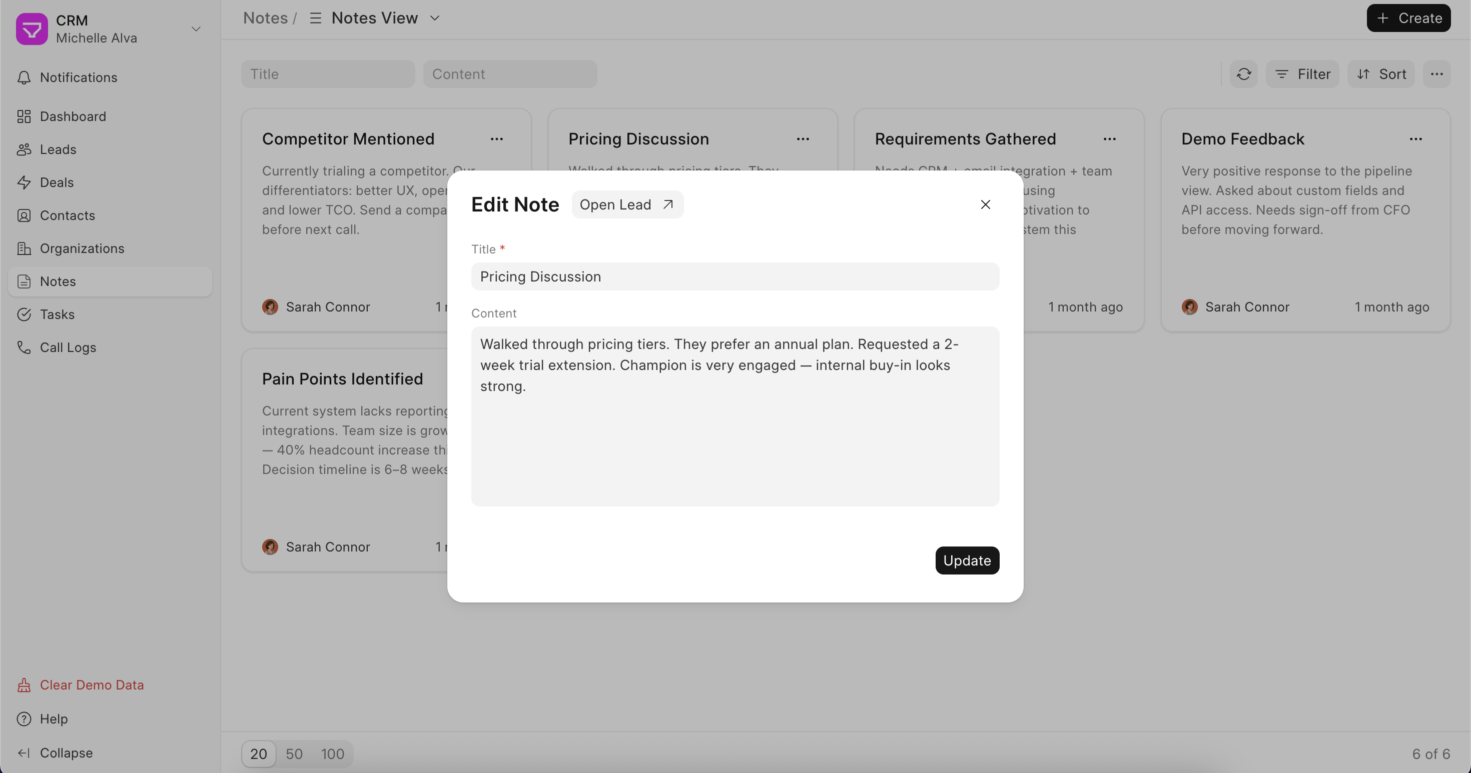Every note is also linked back to the lead or deal it belongs to, so you can jump straight to the record from here.