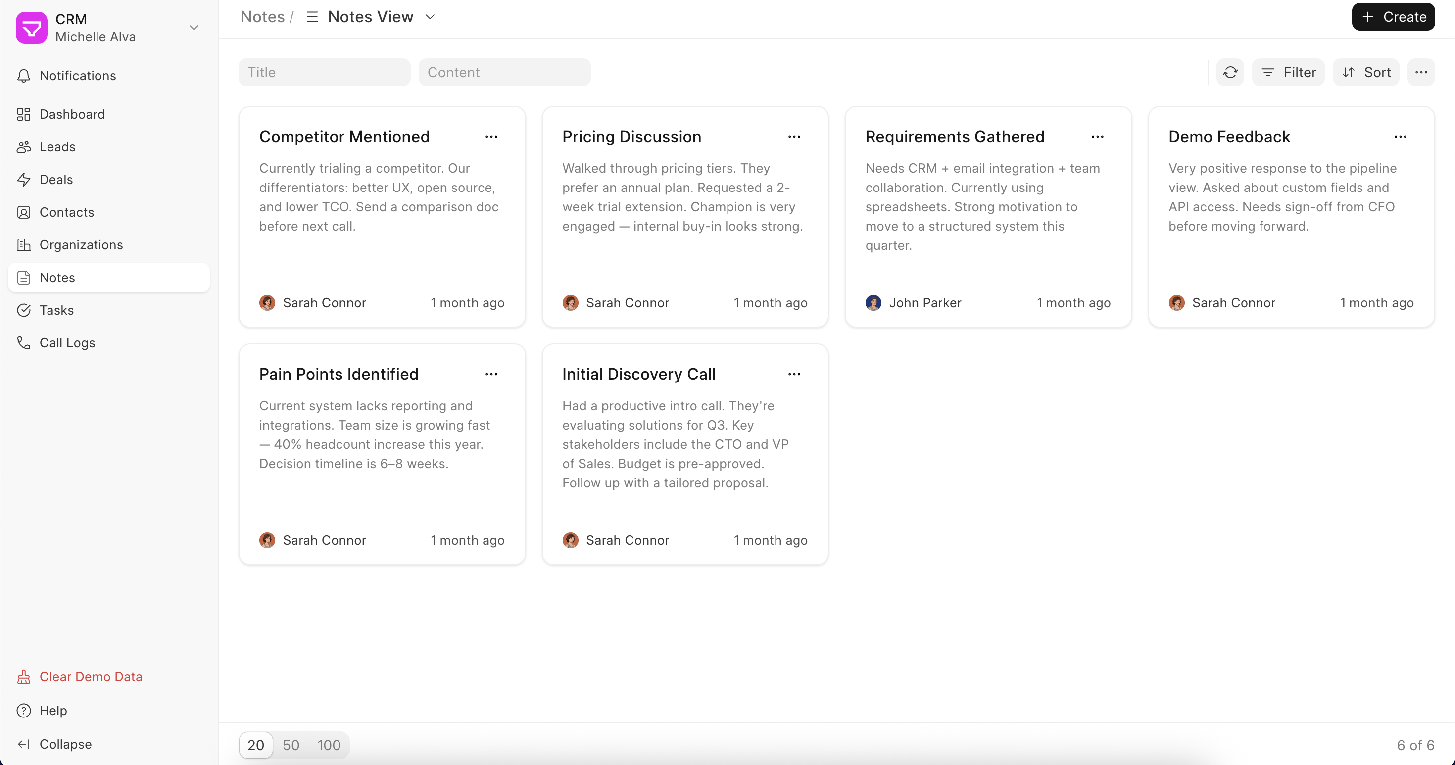Click on Notes in the sidebar to see all notes across your CRM in one place, shown as cards. Each card shows the title, content, who wrote it, and when. You can filter and search to find what you need.