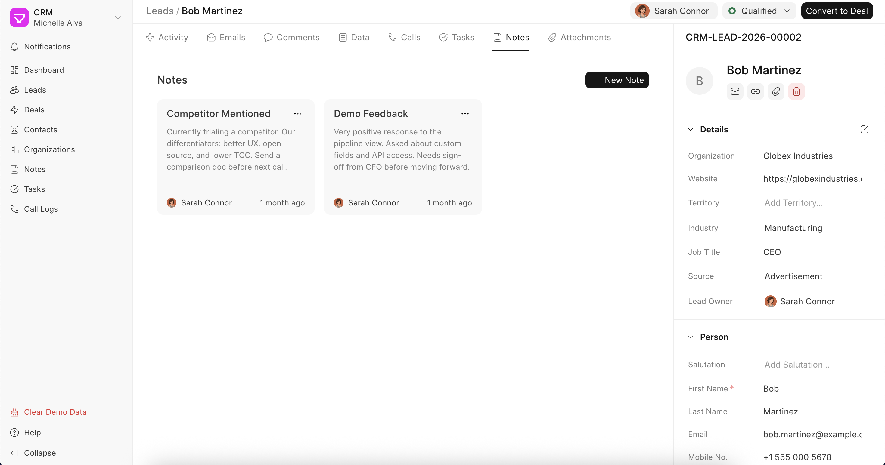 Notes are for capturing anything important about a lead or deal that doesn't fit neatly into a form field. A key thing a prospect mentioned on a call, something to remember before the next meeting, internal context for your team, or anything worth writing down.