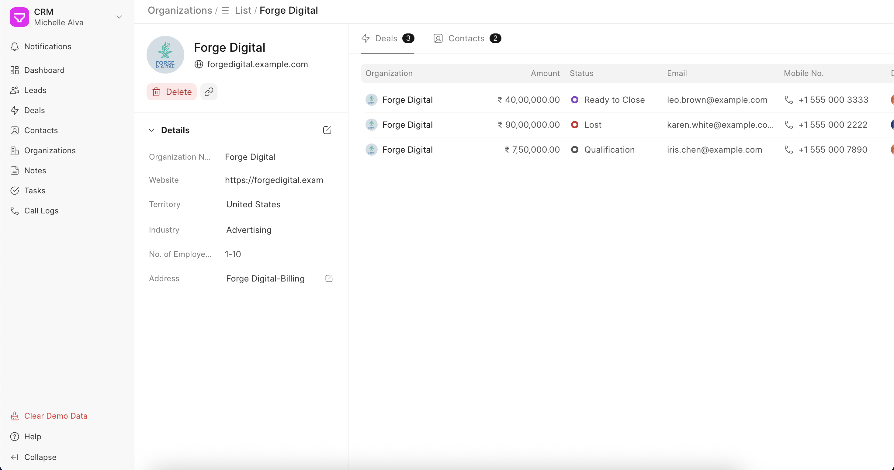 - Deals – Every deal linked to this organization, with the amount and current status. At a glance, you can see where each opportunity stands
