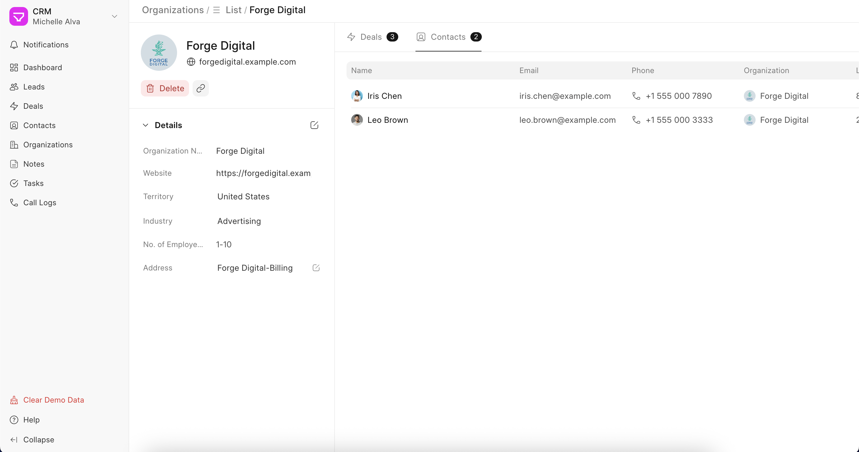 Linked Deals to an Organization - could be a new Deal, Upsell/Cross-sell, Renewal - Contacts – Everyone at this organization who's in your CRM, with their email and phone