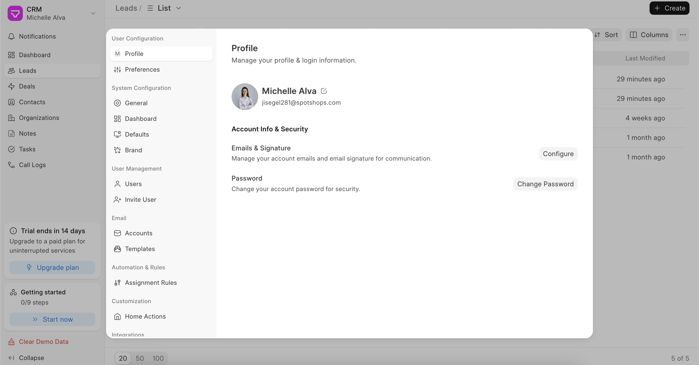 Every user in Frappe CRM has their own profile and preferences. These are personal to you. Changing them won't affect anyone else on your team.