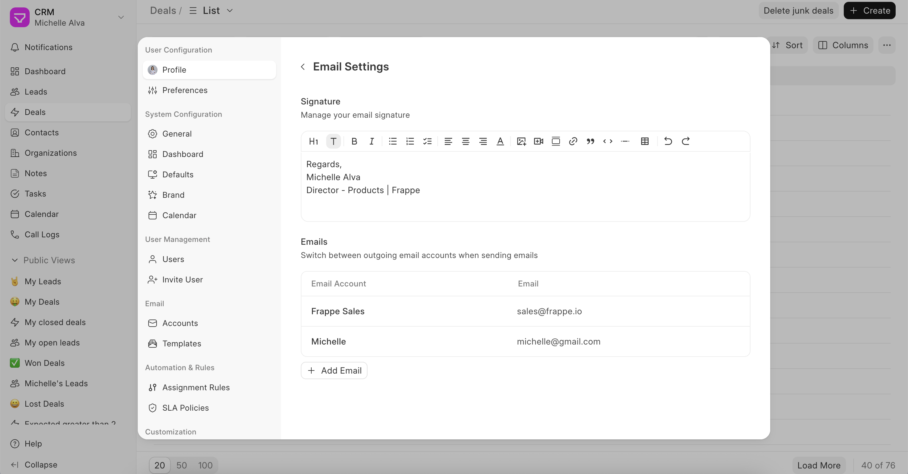 - Signature – Write your email signature once, and it'll automatically appear at the bottom of every email you send from the CRM